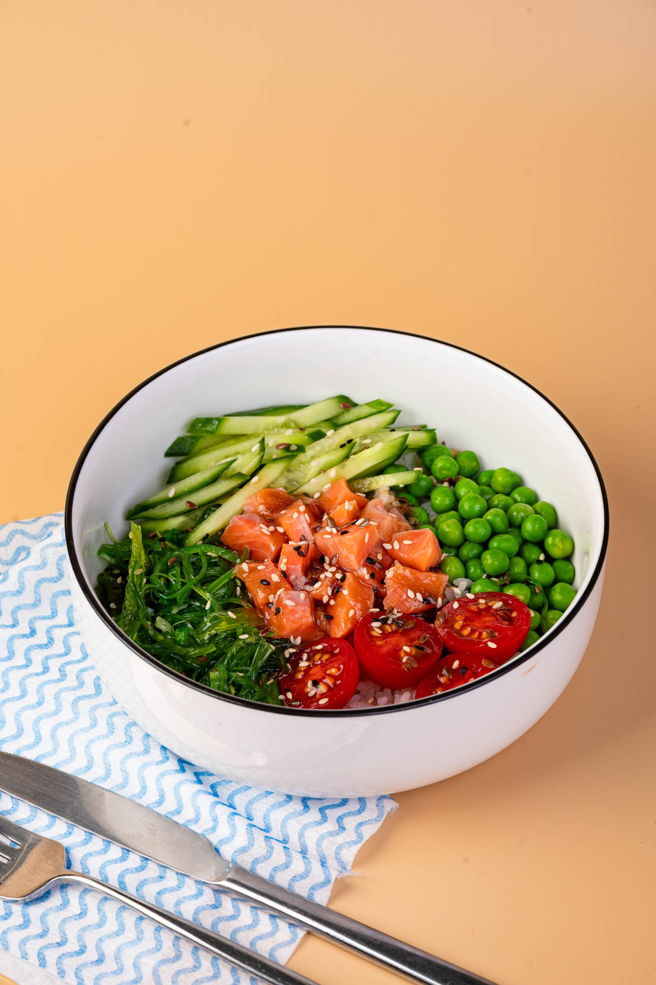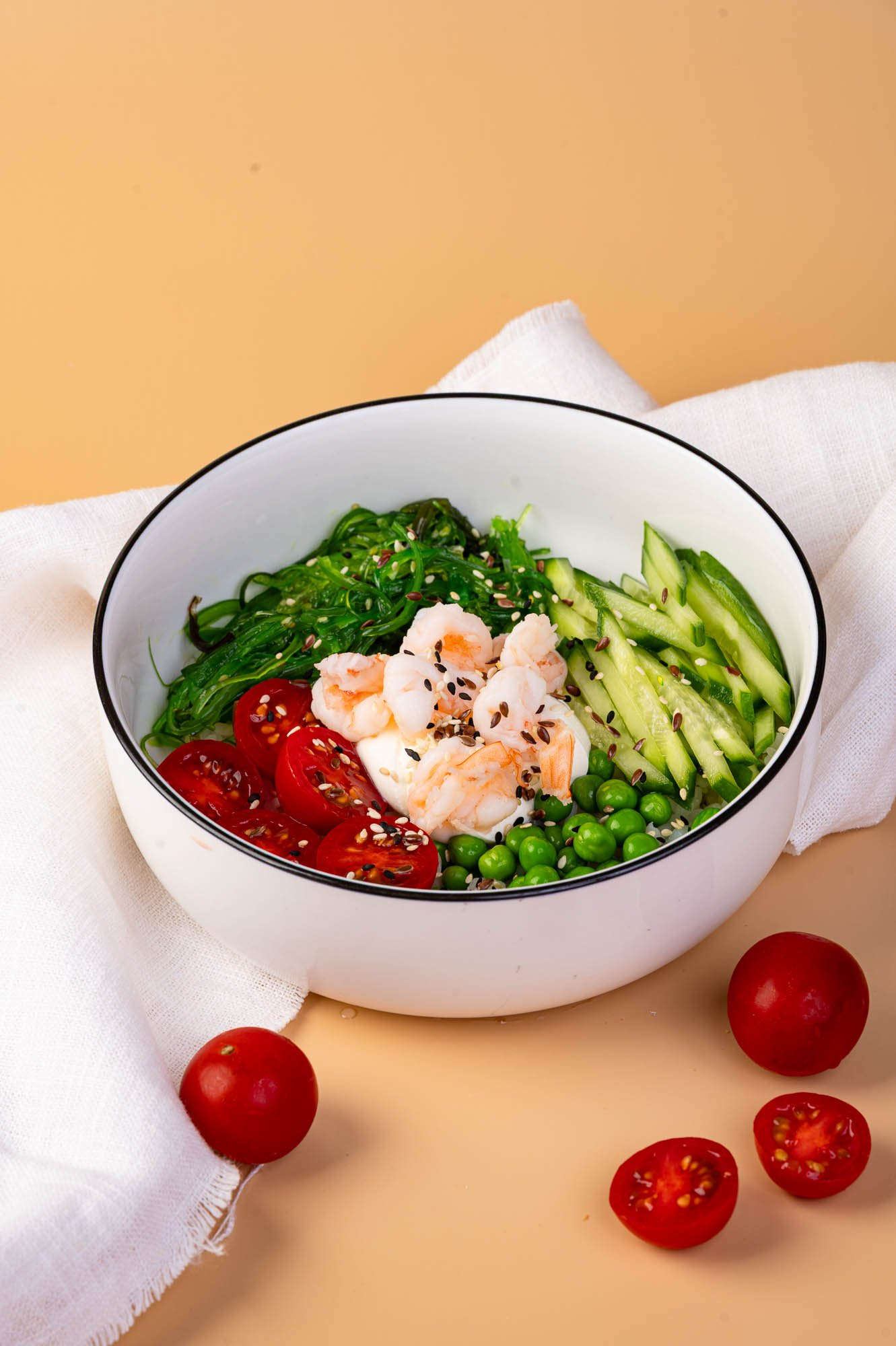 Нежные креветки в пикантном сливочном соусе, рис, свежие овощи, зелёный горошек и салат чука на хрустящей подушке из листьев салата. Состав: Креветка, салат свежий, соус сливочный с хреном (крем сливочный, молоко сгущённое, хрен острый), огурец свежий, салат чука, помидор черри, горошек зелёный мороженый, кунжут, рис Энергетическая ценность на 100 г (Б/Ж/У/К/кДж): 8 / 5 / 10 / 113 / 473 Вес: 268 г