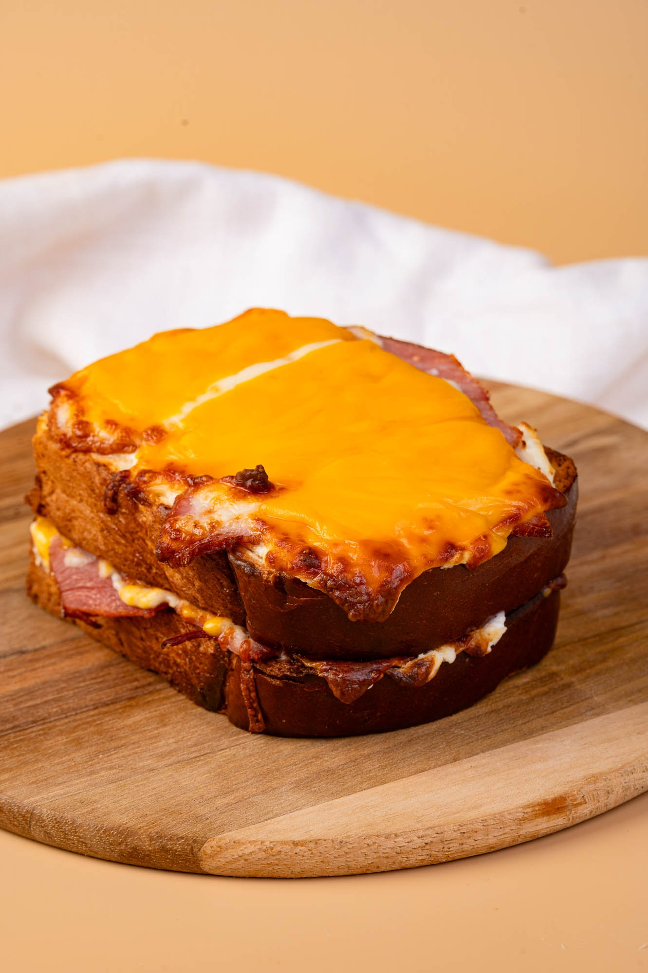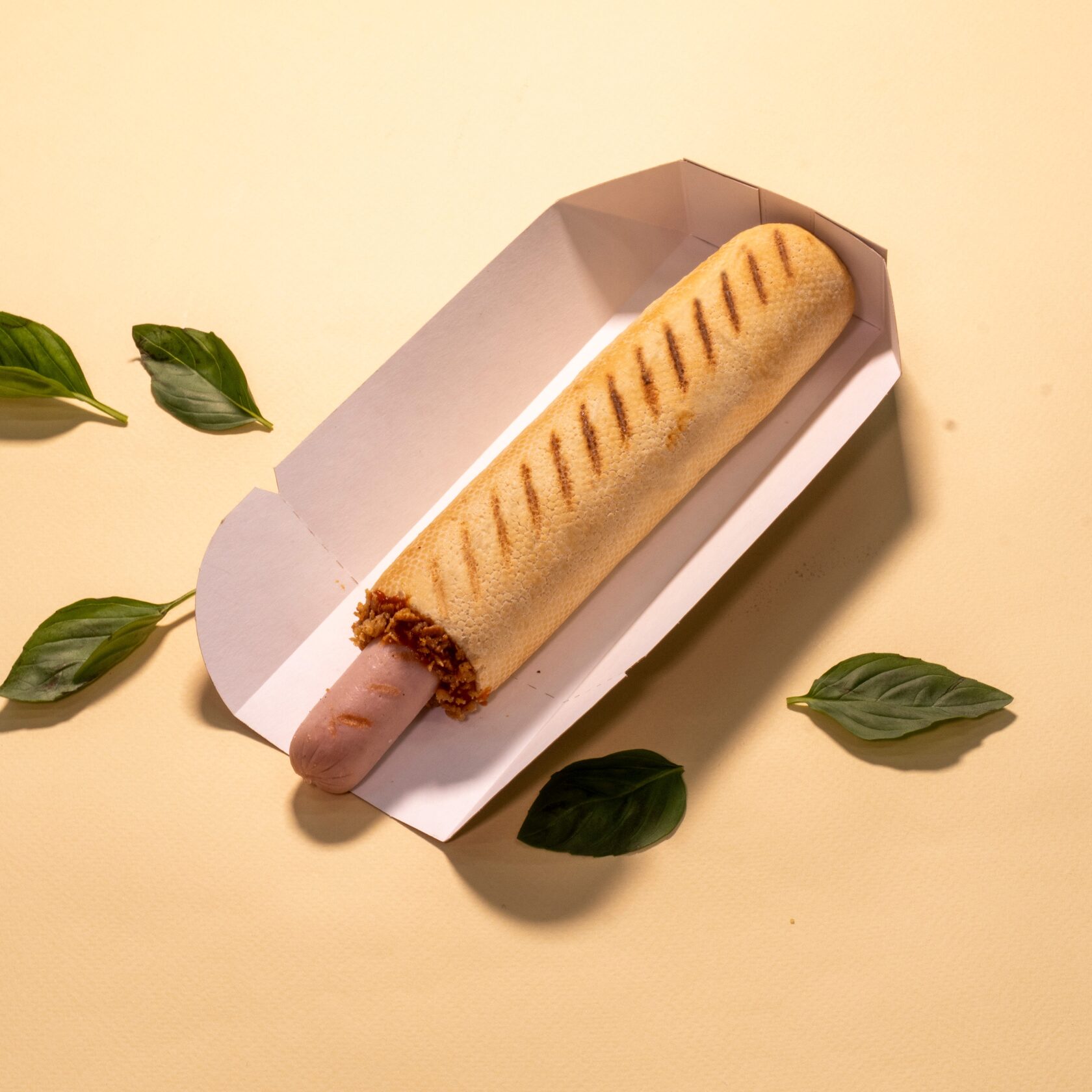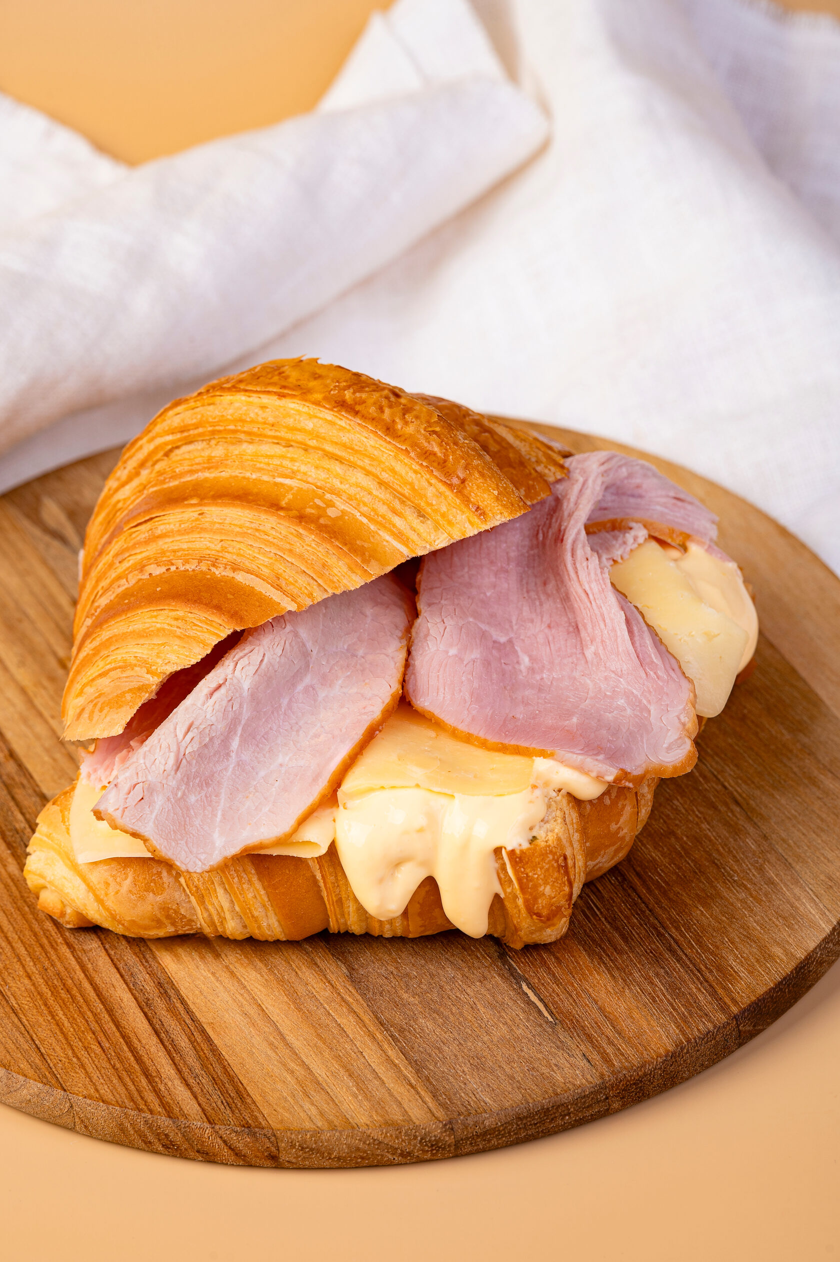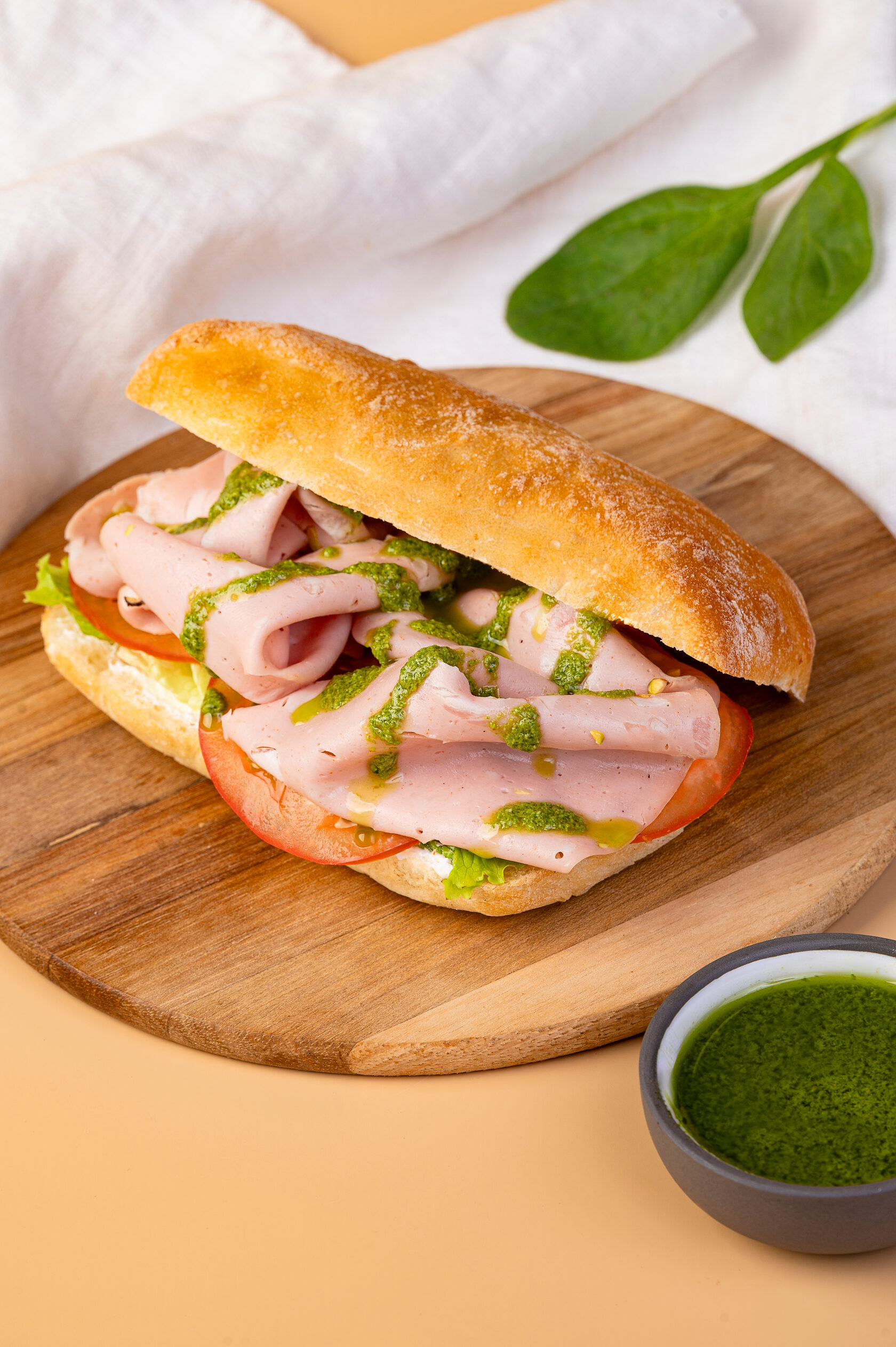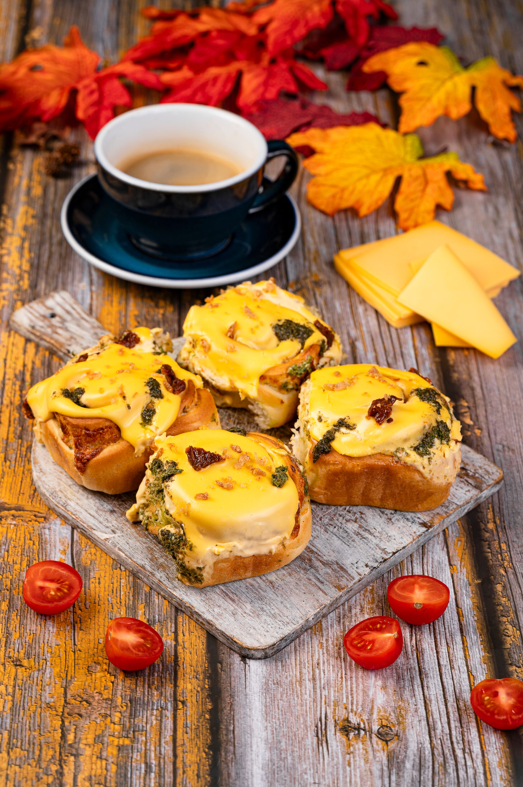 Гастрономическая булочка — насыщенное сочетание сыра Чеддер, моцареллы и окорока с соусами песто и бешамель, в сопровождении вяленых томатов и золотистого жареного лука.