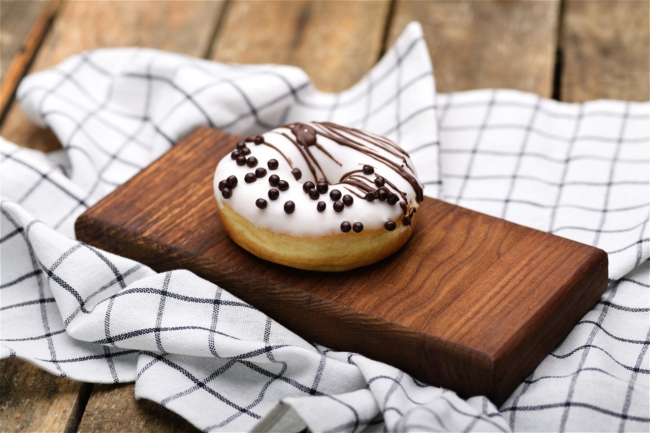 Фирменный донат в классическом исполнении, украшенный сахарной помадкой Состав: Глазурь белая, шоколад черный, тесто дрожжевое 80 гр КБЖУ: 3,72/8,96/55,99/319,51/1336,81