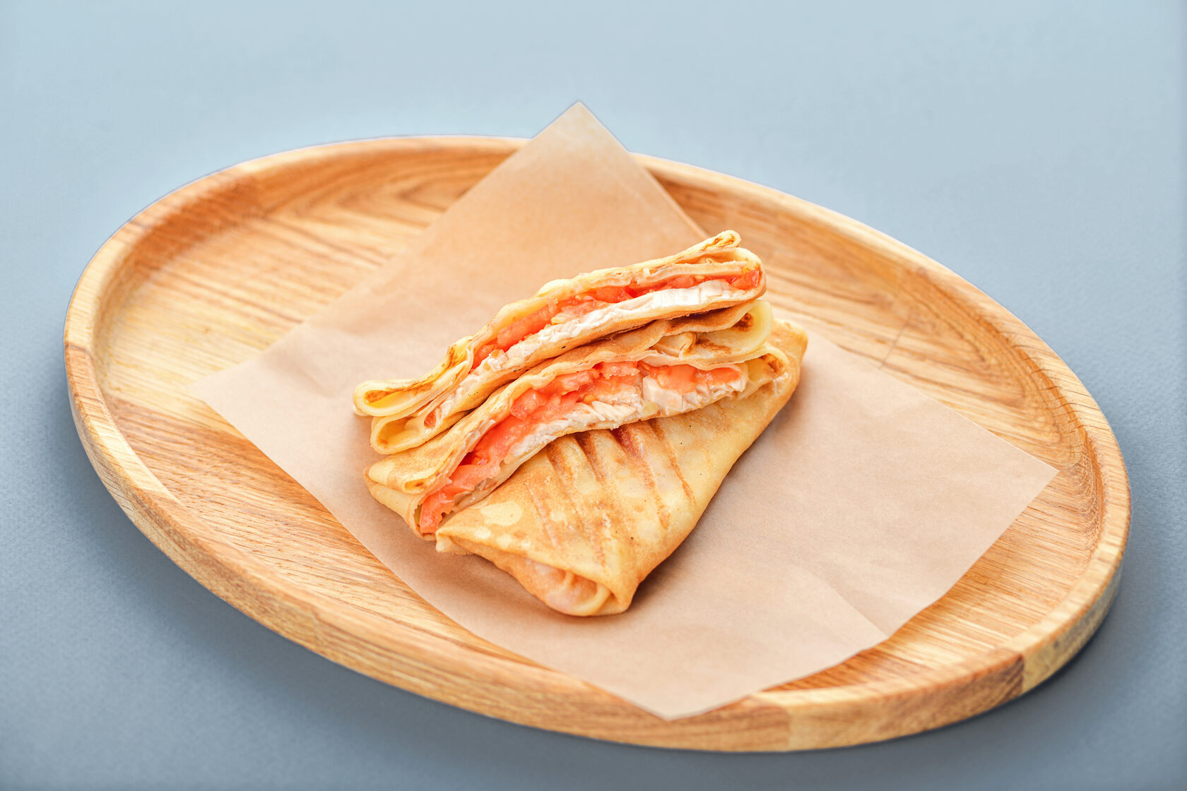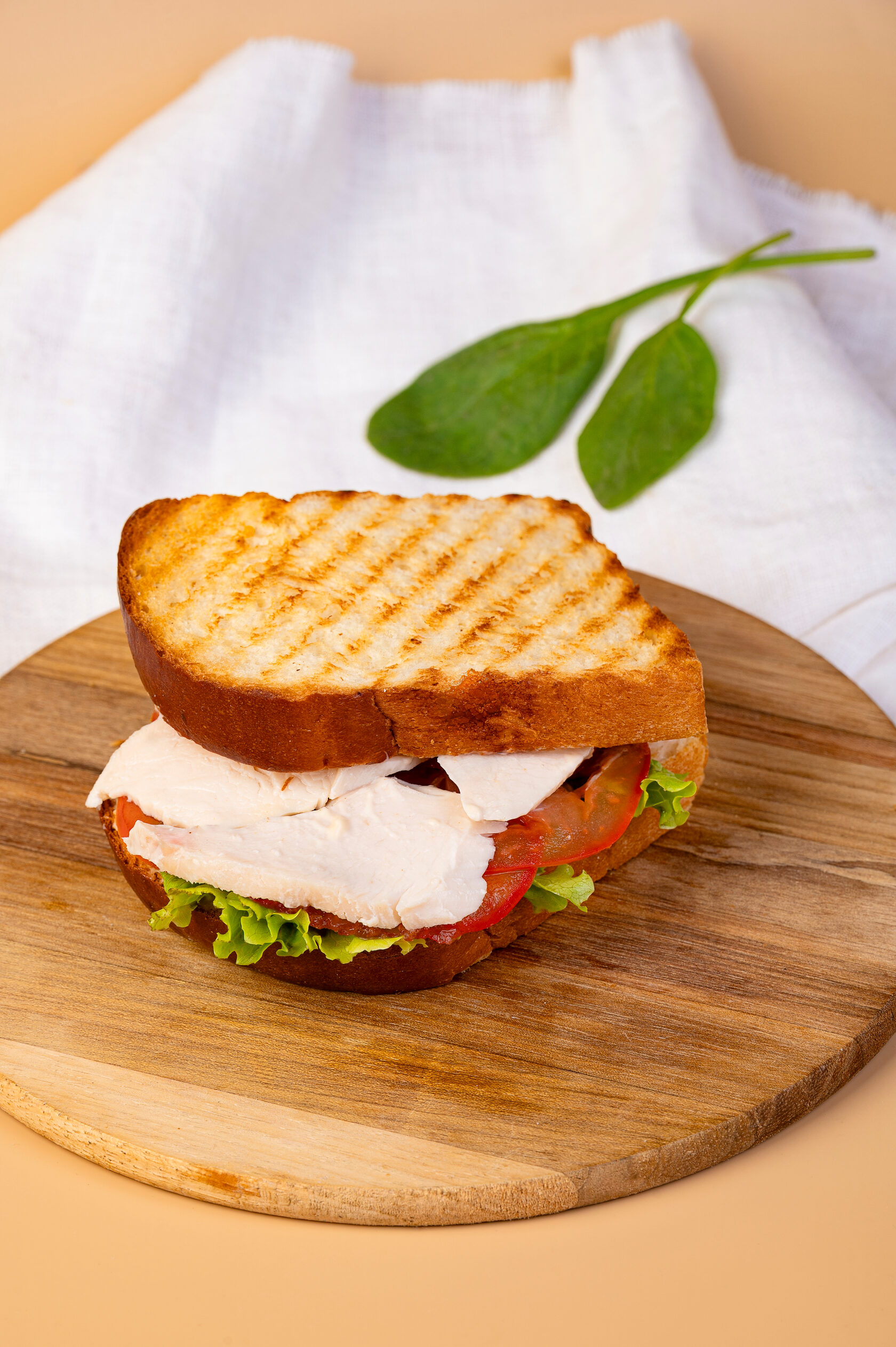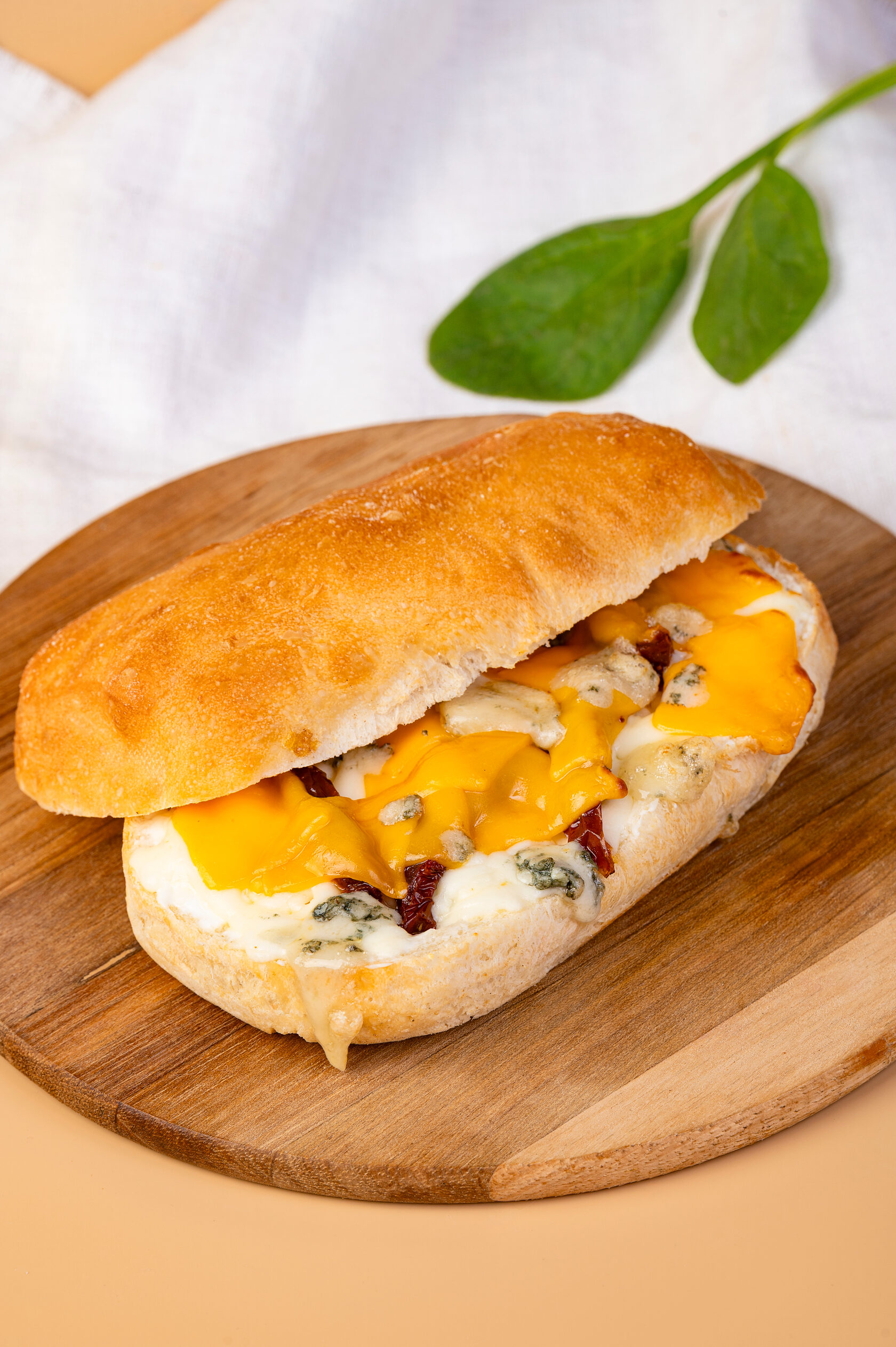 Хрустящая чиабатта с нежным сливочным кремом, тянущейся моцареллой, пикантным сыром с голубой плесенью и насыщенным чеддером, дополненная ароматными вялеными томатами.