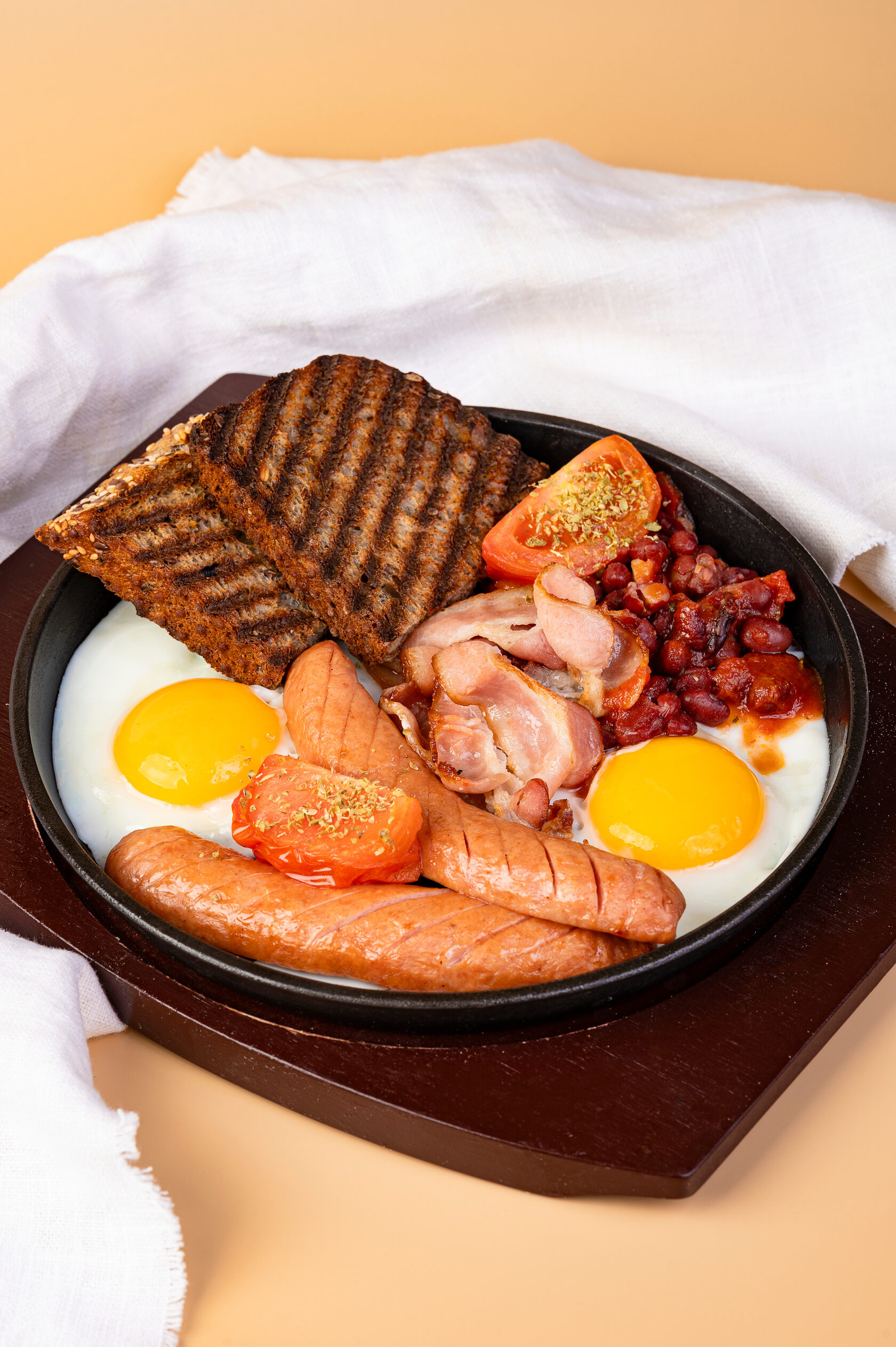 Сытный завтрак, для тех, кому необходимо восстановить силы или зарядиться энергией на весь день. На сковороде запекаем печеный картофель с 2мя куриными яйцами, в нашем фирменном соусе из помидор, пикантными охотничьими колбасками, беконом и карамелизированным луком. Подаем со свежеобжаренным тостом из хлеба тартин.
