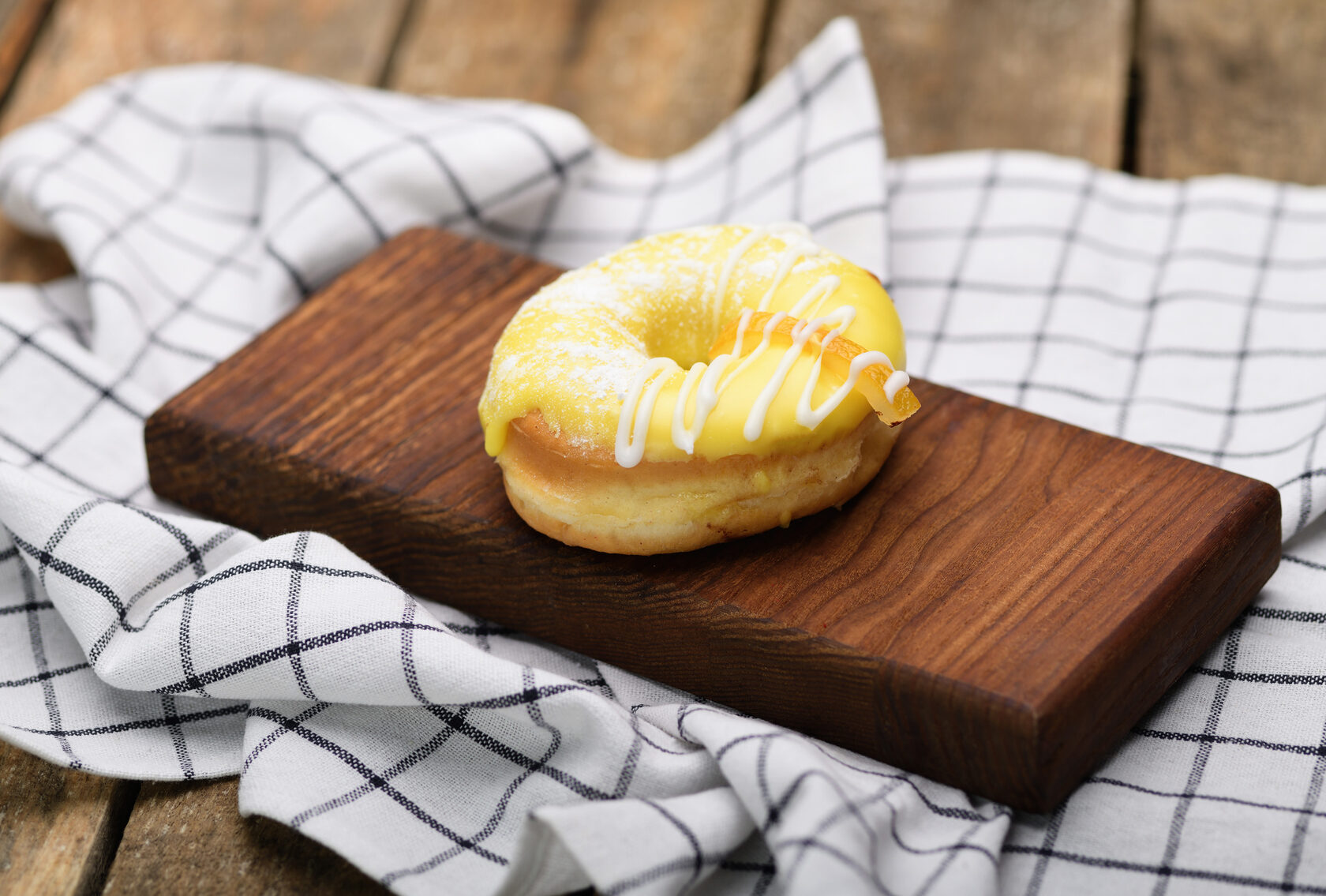 Вес: 111 г Описание: Фирменный донат с экзотической начинкой из крема манго-маракуйя, украшенный помадкой из японского лимона юзу и апельсиновым цукатом. Состав: Глазурь со вкусом лимона, апельсины засахаренные, дрожжевое тесто, желатин, сахар, пюре маракуйя, яйцо, масло сливочное, пюре манго, сок лимона. Б/Ж/У/ккал/кДж: 3,59/12,04/66,17/347,37/1 453,39