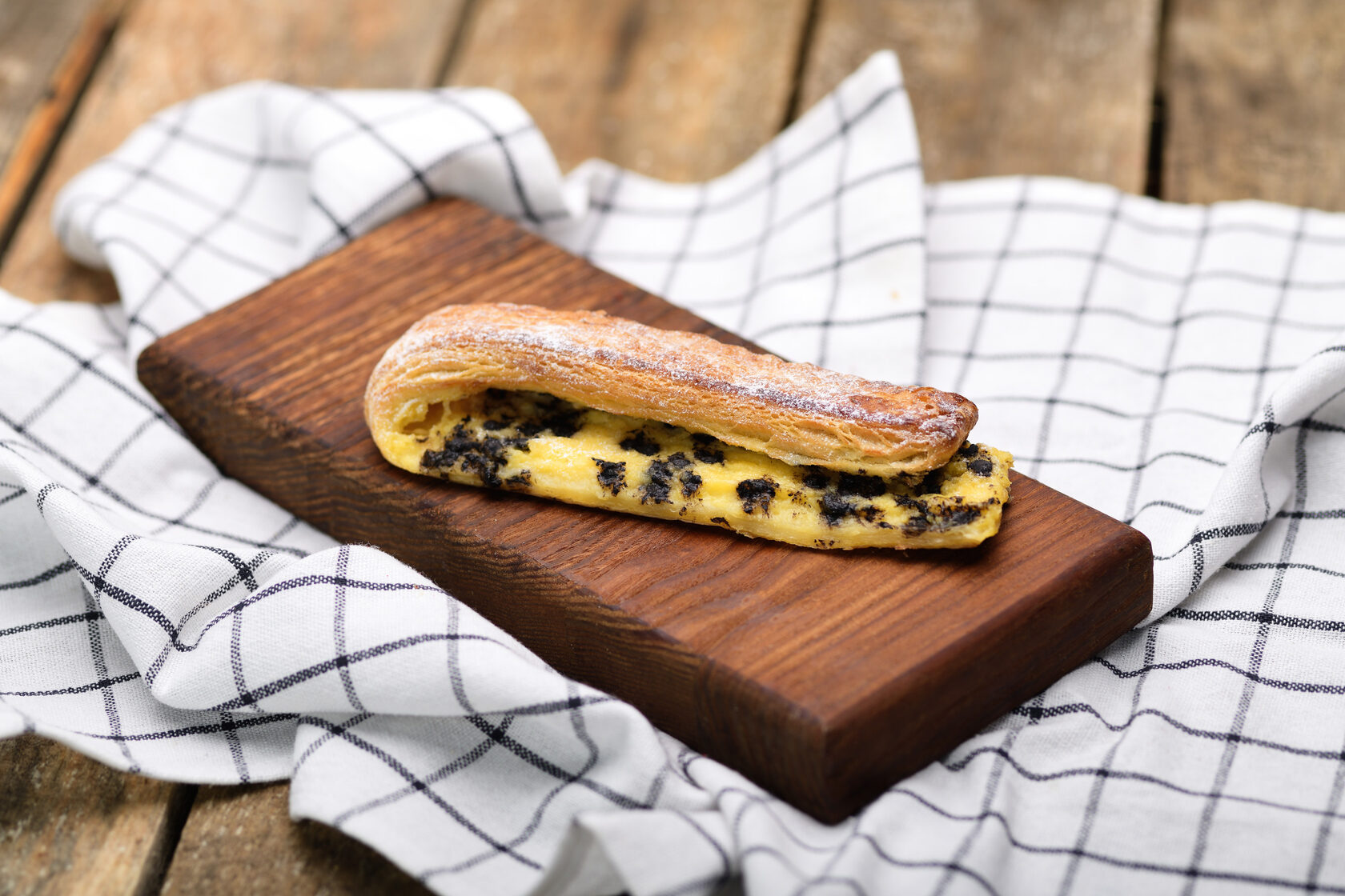 Вес: 85 г Описание: Воздушное слоеное тесто с начинкой из заварного крема с кусочками темного шоколада. Состав: Пудра сахарная, яйцо, тесто слоеное дрожжевое, молоко, глазурь шоколадная черная. Б/Ж/У/ккал/кДж: 4,04/11,76/29,34/239,37/1 001,54