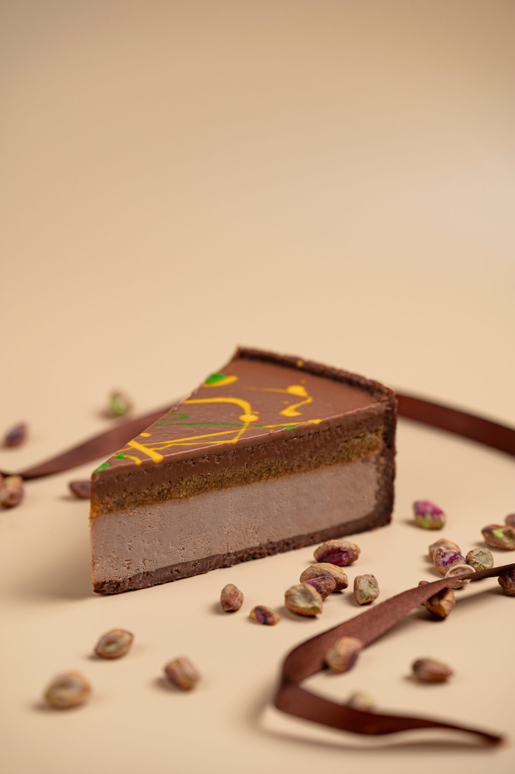 Насыщенный шоколадный десерт с прослойкой из кадаифа с фисташковой пастой, на основе нежного сырного крема и хрустящей шоколадной основы из печенья с какао, покрытый тонкой молочной глазурью.