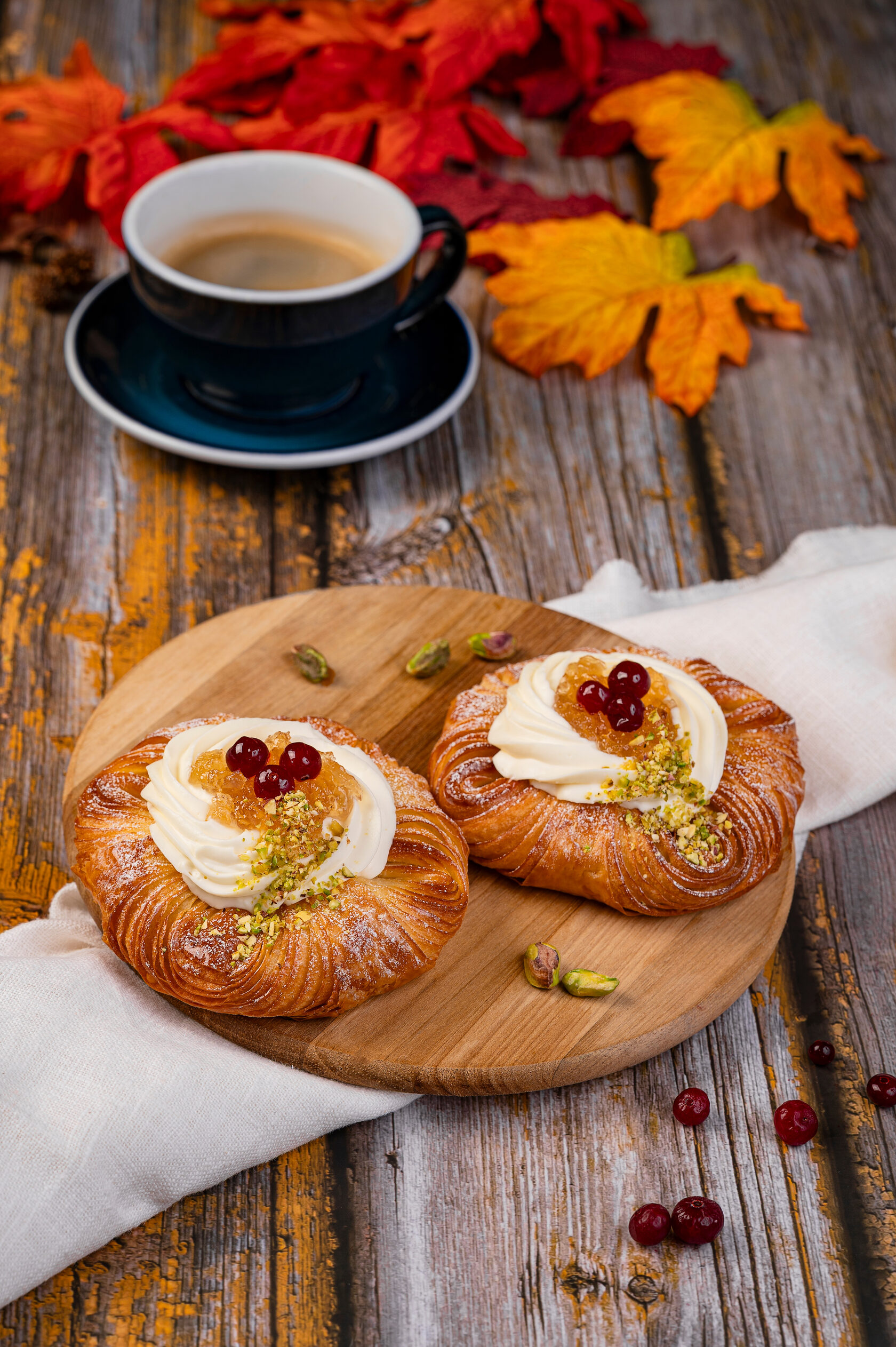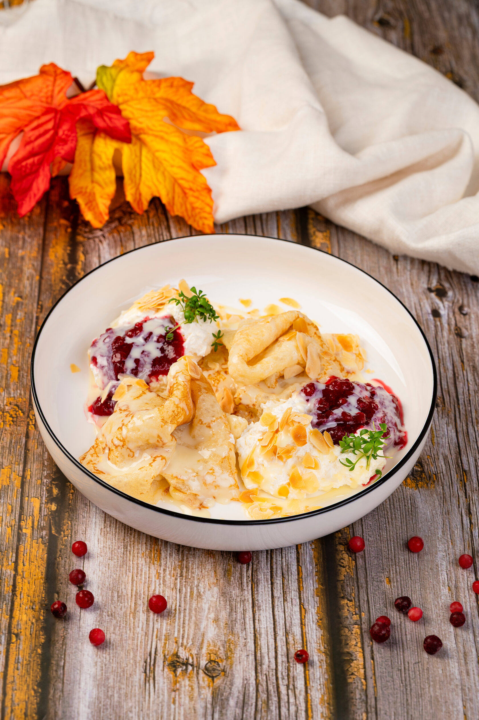 Обжарены до золотистой корочки с взбитой сметаной и соусом на Ваш выбор: - крем лайм-кокос - пряный вишнёвый соус - сгущёнка