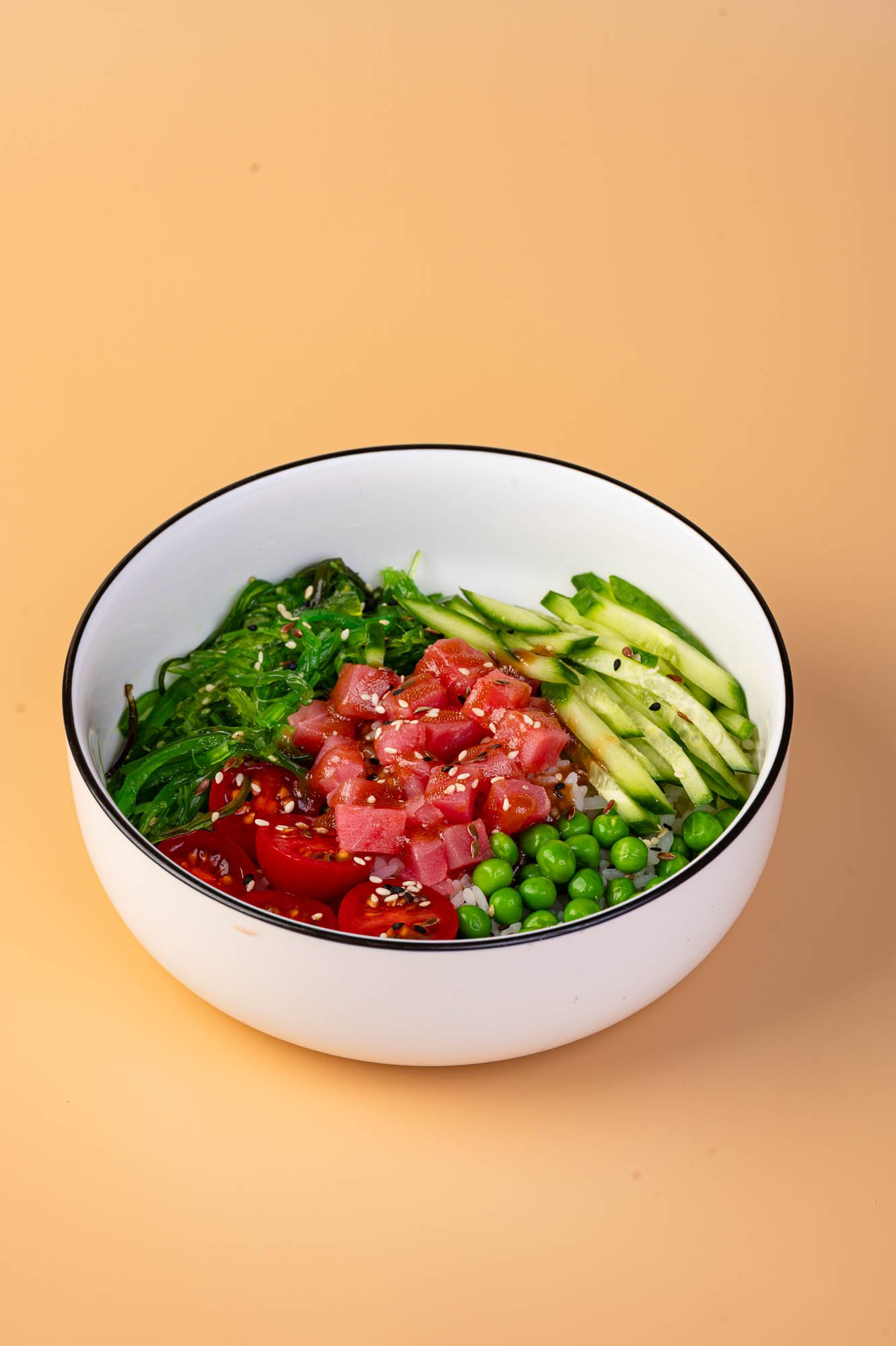 Лёгкое и вкусное блюдо: свежий тунец, рис, овощи, морской салат чука и кунжут, всё под ароматной заправкой с терияки. Отличный выбор, если хочется чего-то питательного и свежего. Состав: Рис, Заправка (Масло растительное, Соус Терияки, Соус соевый), Тунец филе, Огурец свежий, Горошек зеленый мороженный, Помидор Черри, Салат чука, Кунжут Энергетическая ценность на 100 г (Б/Ж/У/К/кДж): 3/6/11/110/462 Вес: 274 г