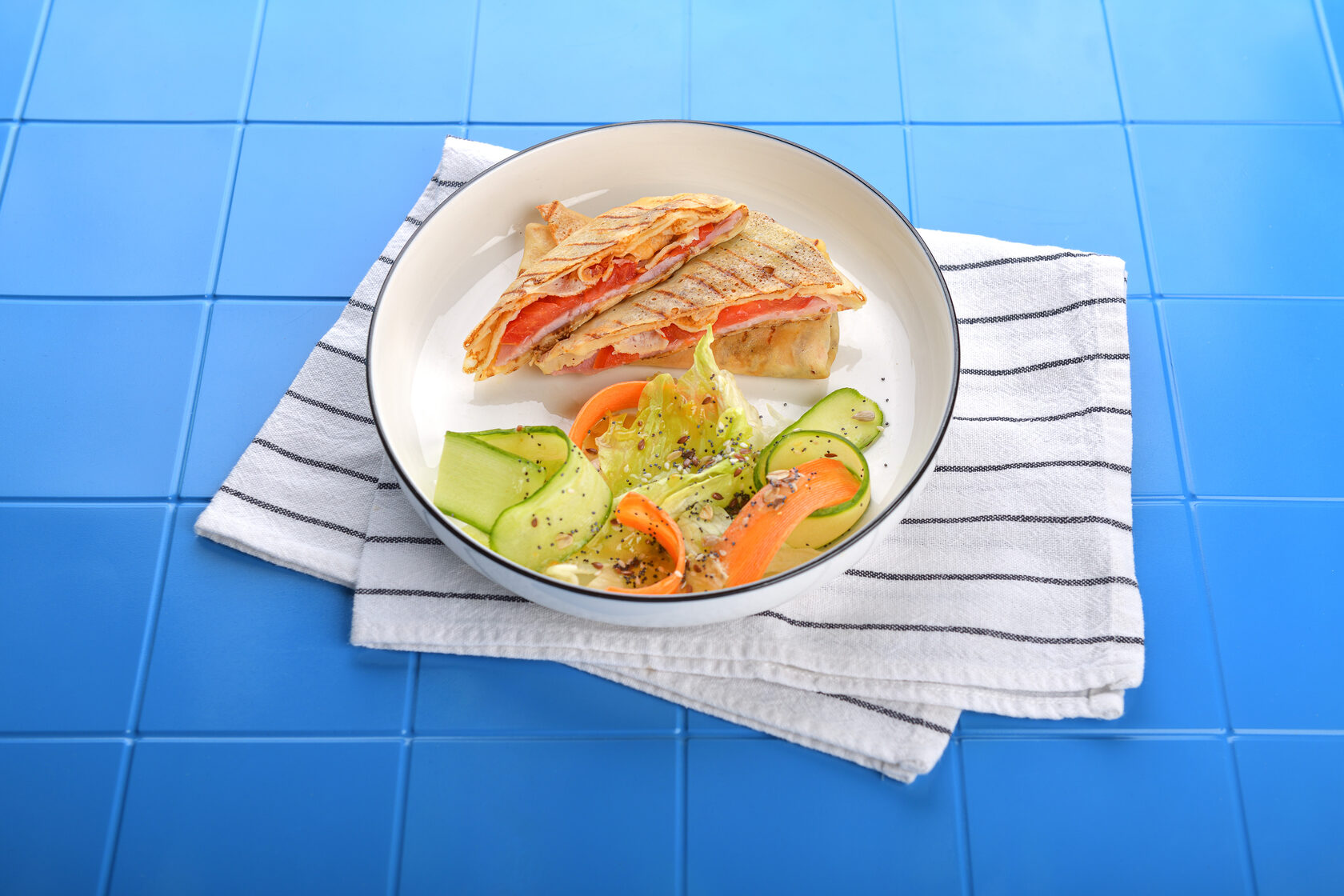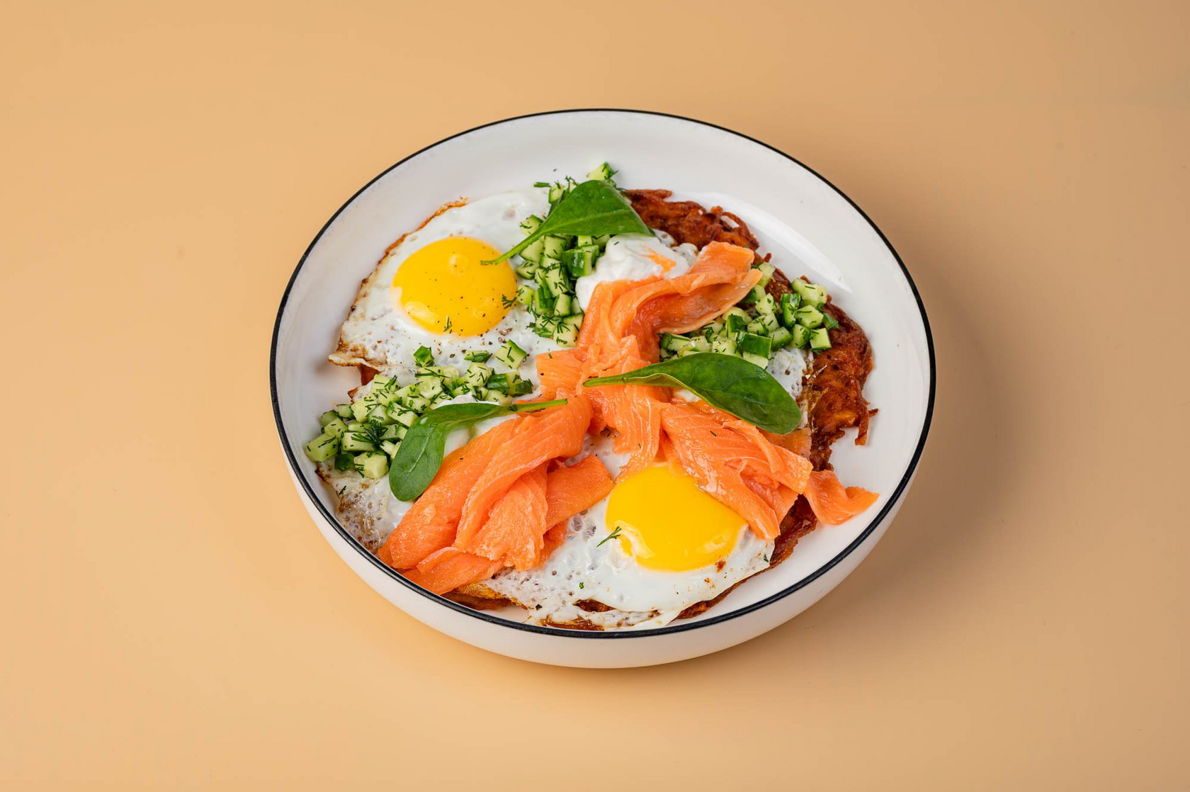 Наш топовый завтрак стал еще ярче! Картофельный драник подаем с двумя яйцами глазунья, слабосоленой красной рыбой, свежими огурцами, шпинатом и зеленью.