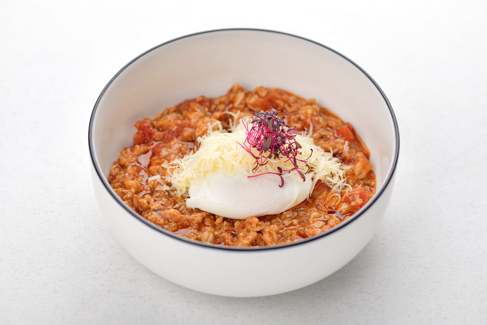 Сочетает в себе нежную текстуру овсяных хлопьев и насыщенный вкус томатного соуса. Ароматные помидоры конкасе добавляют свежести и яркости, а свежий соус песто придает блюду изысканный оттенок базилика и орехов. Каждый кусочек тает во рту благодаря утонченному сыру Пармезан Dolce. Завершает это великолепие микрозелень, придающая блюду не только аппетитный вид, но и дополнительную питательность.
