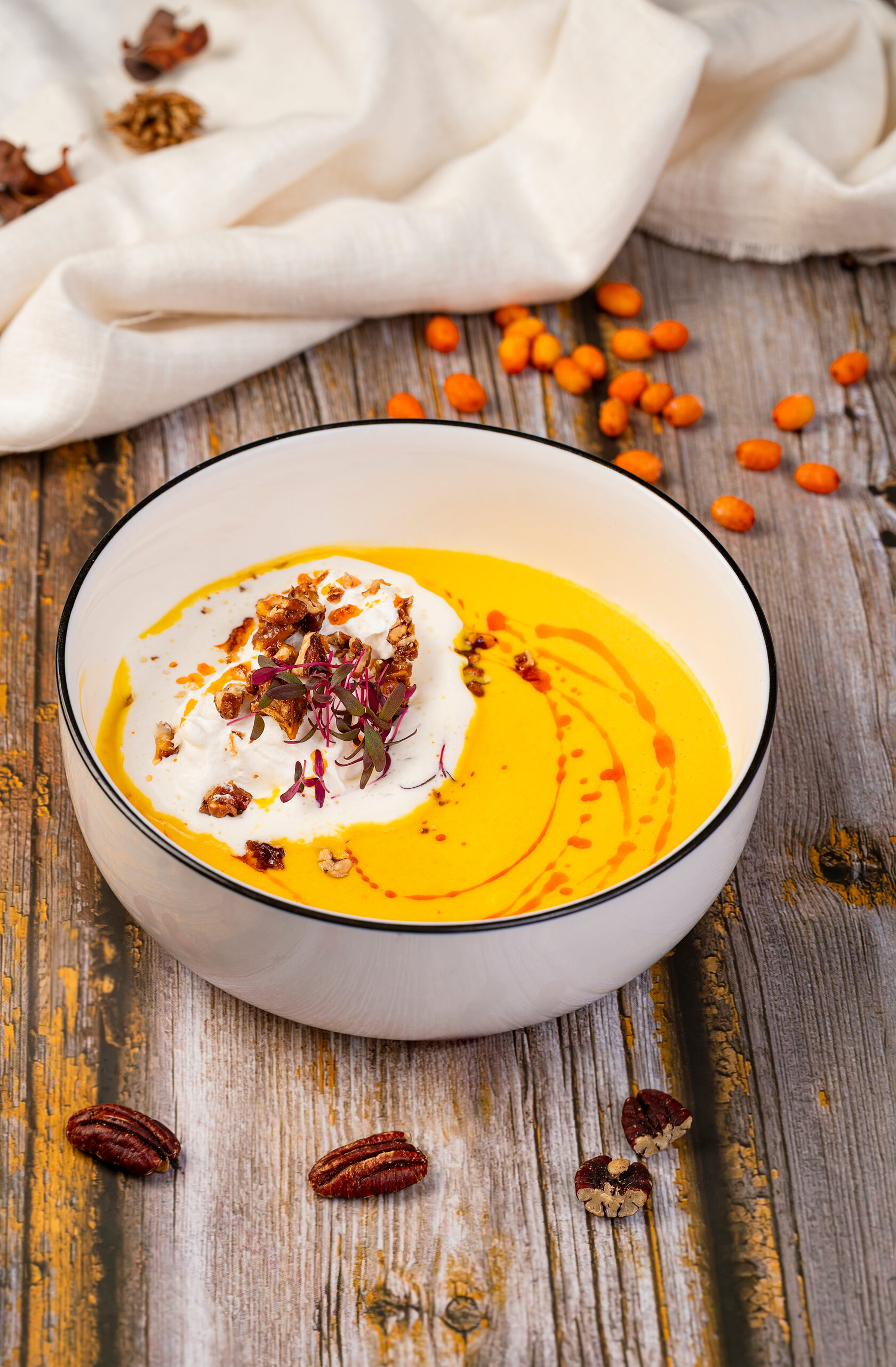 Лёгкий и яркий салат из запечённой тыквы, маринованной свеклы и свежей зелени с кленовой заправкой. Дополняется брусничным конфи и миндальными лепестками.