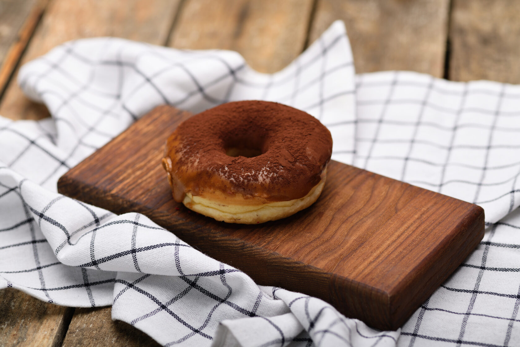 Вес: 97 г Описание: Фирменный донат с кремом из маскарпоне, украшенный карамелью и какао. Состав: Глазурь со вкусом карамели, какао, дрожжевое тесто, сыр маскарпоне. Б/Ж/У/ккал/кДж: 3,56/12,93/53,18/343,35/1 436,57