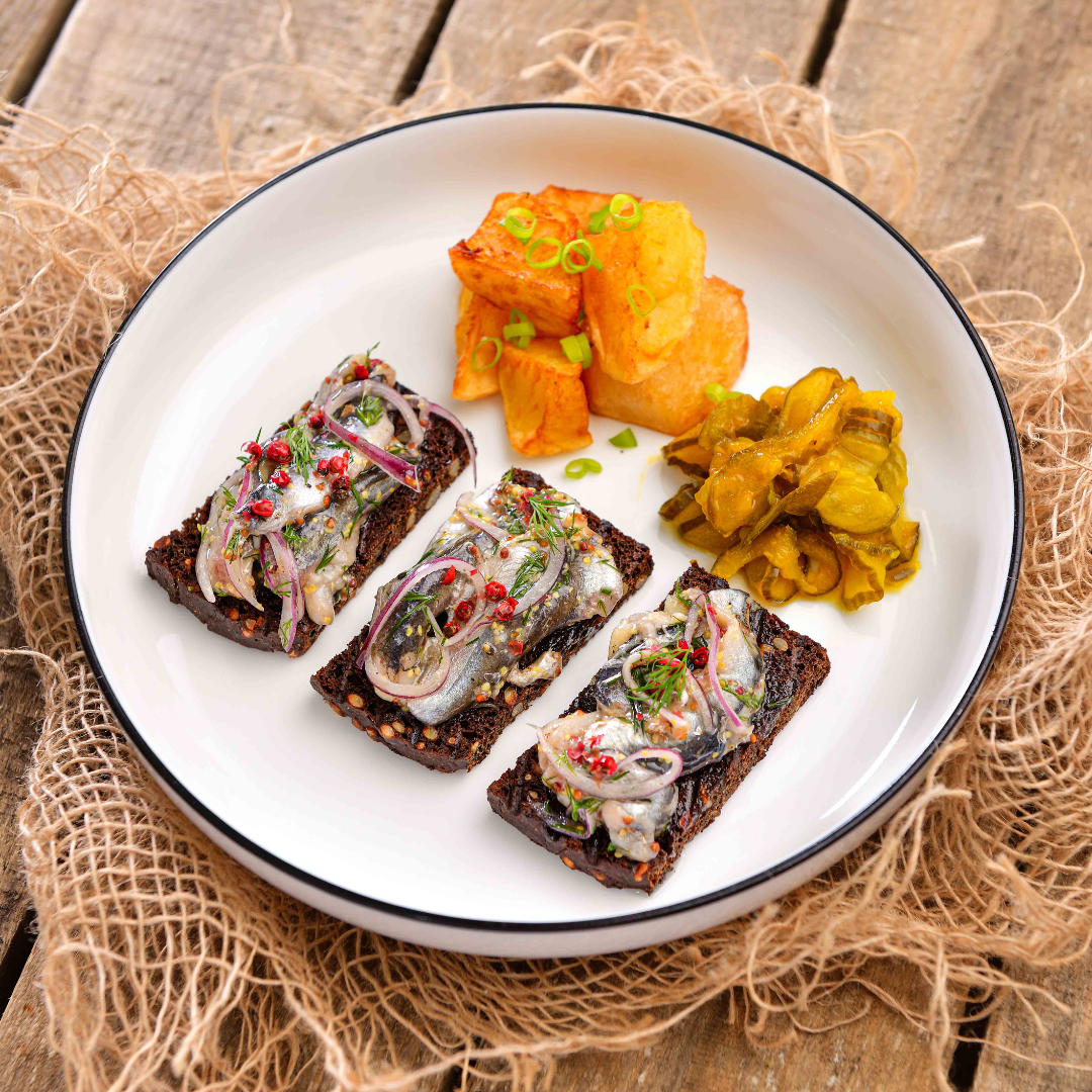 Брускетты с балтийской маринованной килькой подаем на классическом темном хлебе Даугас и дополняем поджаренным картофелем и пикантными огурцами пикули.