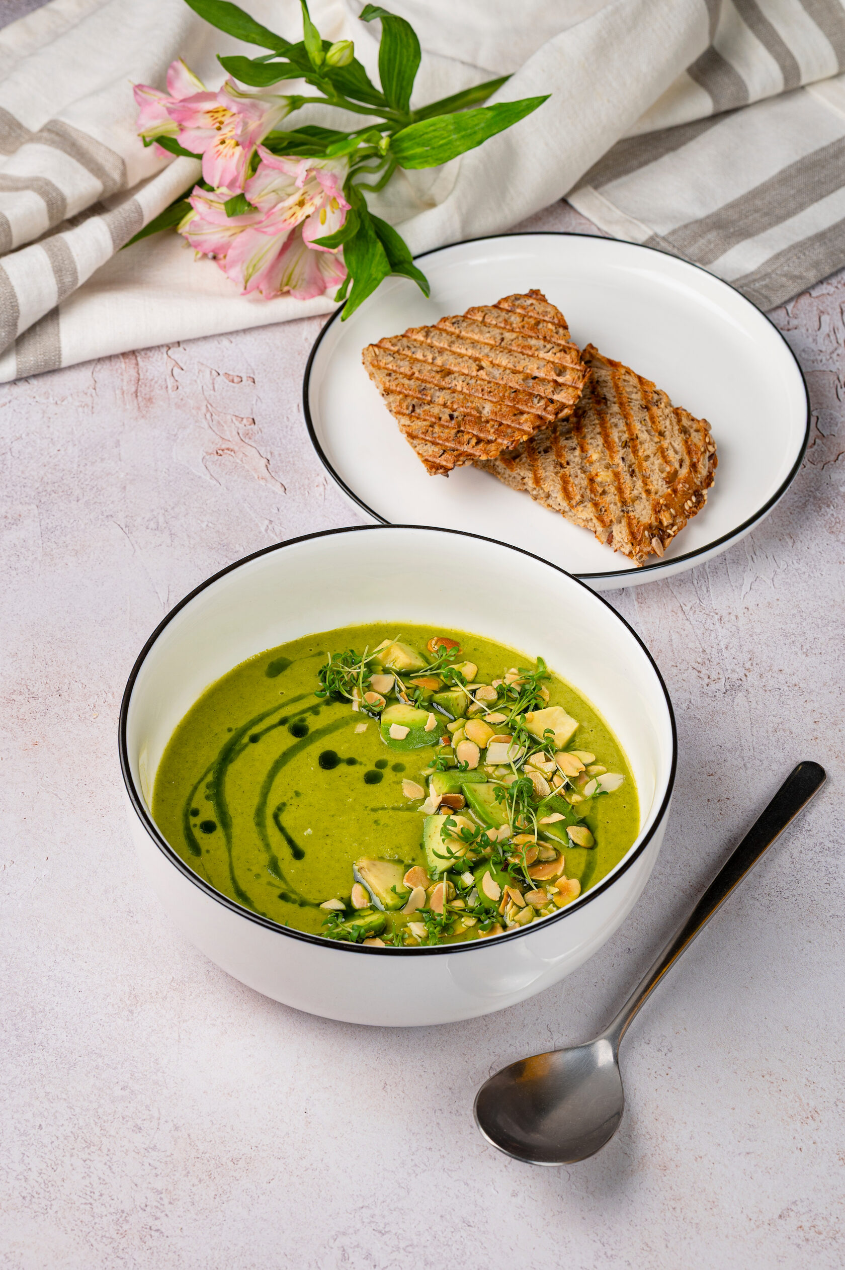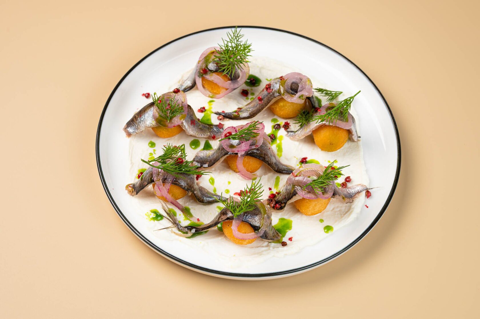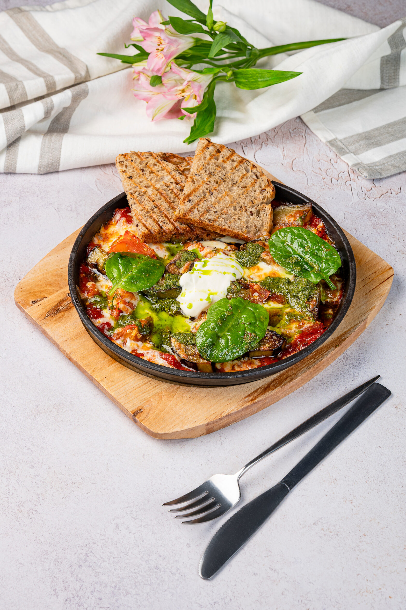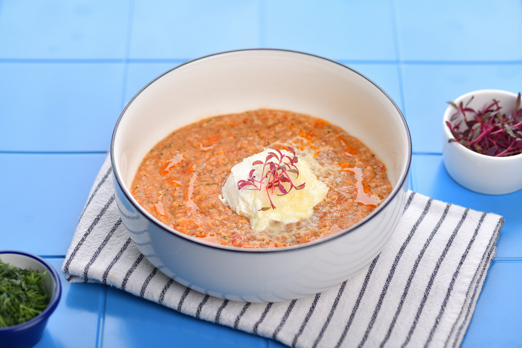 Сочетает в себе нежную текстуру овсяных хлопьев и насыщенный вкус томатного соуса вместе с яйцом пашот. Блюдо дополнено соусом песто, сыром пармезан и микро зеленью.