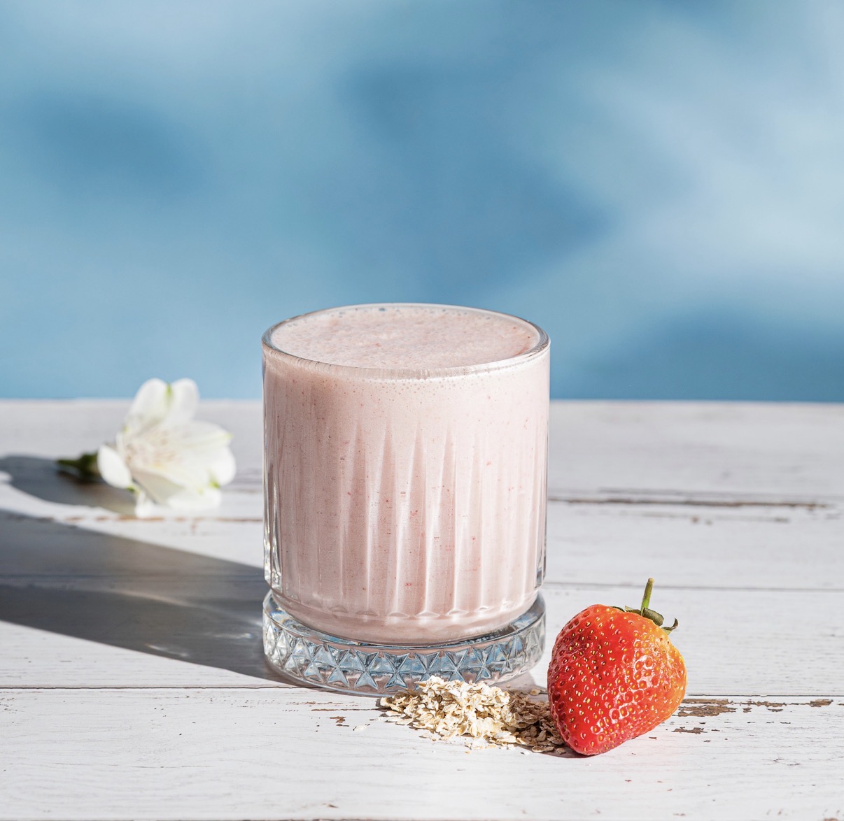 Описание: Питательный смузи на основе овсяного молока, с добавлением банана и натуральной клубники. Яркий освежающий смузи с насыщенным вкусом клубники.