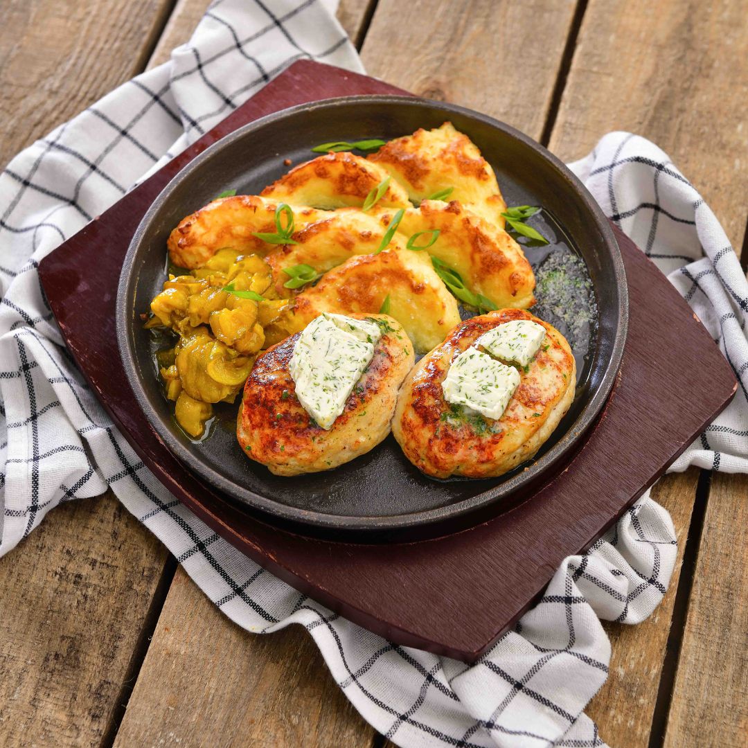 Нежные котлеты из филе щуки подаем с чесночным сливочным маслом, за счет которого котлеты получаются очень сочными. В качестве гарнира пюре, запечённое в духовке, и пикантные огурцы пикули.