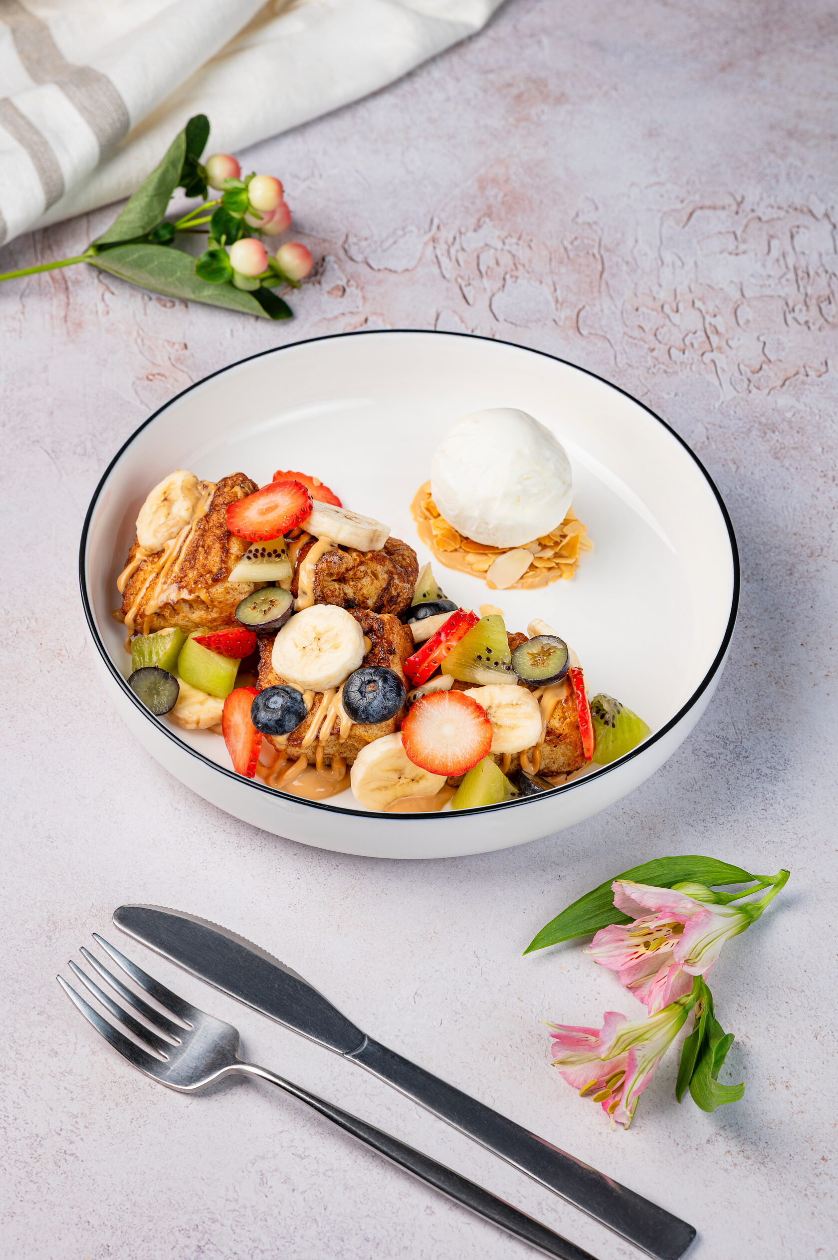 Наш фирменный топовый завтрак из нежного творога. Обжареные до золотистой корочки сырники со сметаной и соусом на ваш выбор: вишневый соус, сгущенка, конфитюр манго.