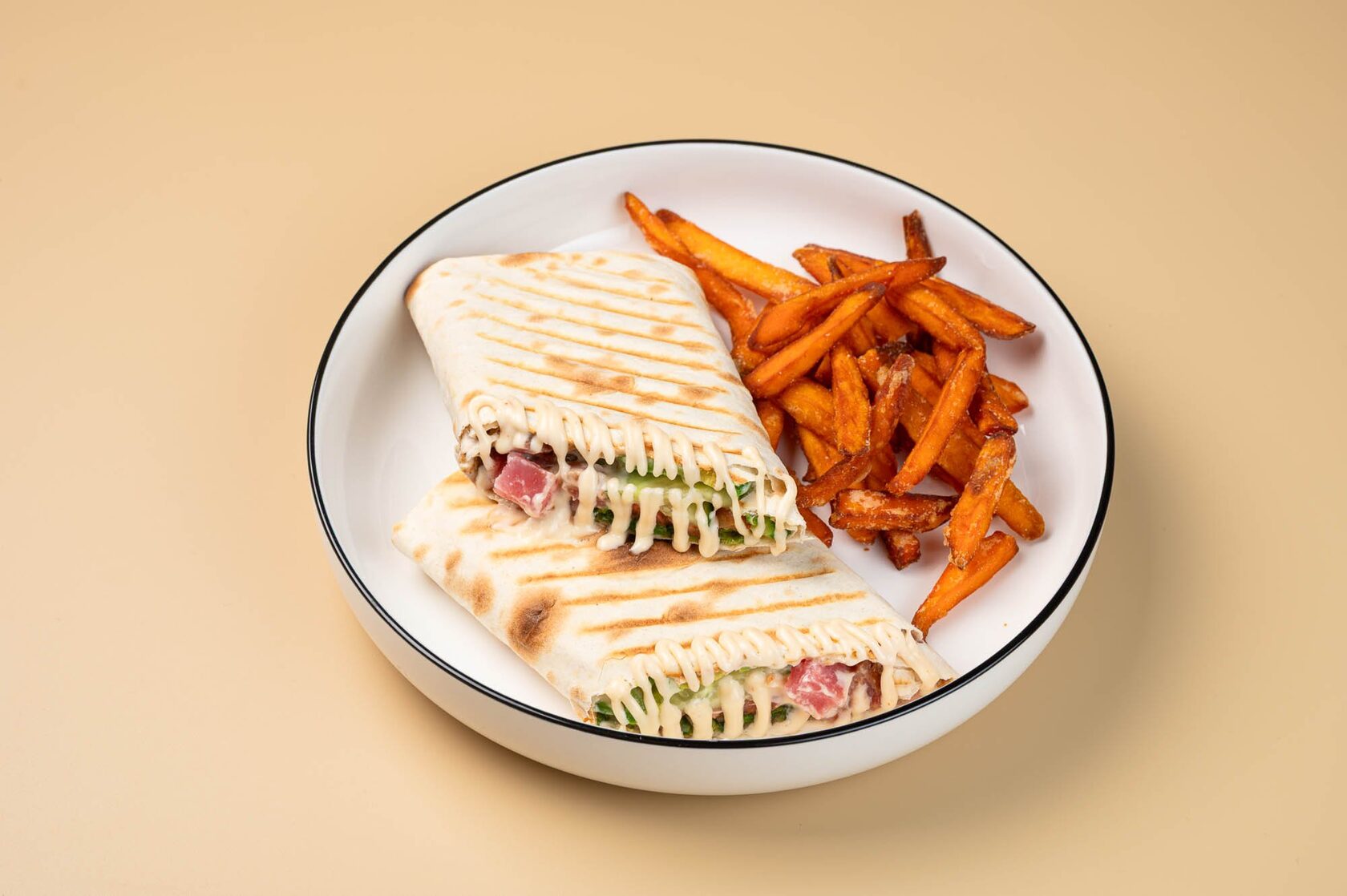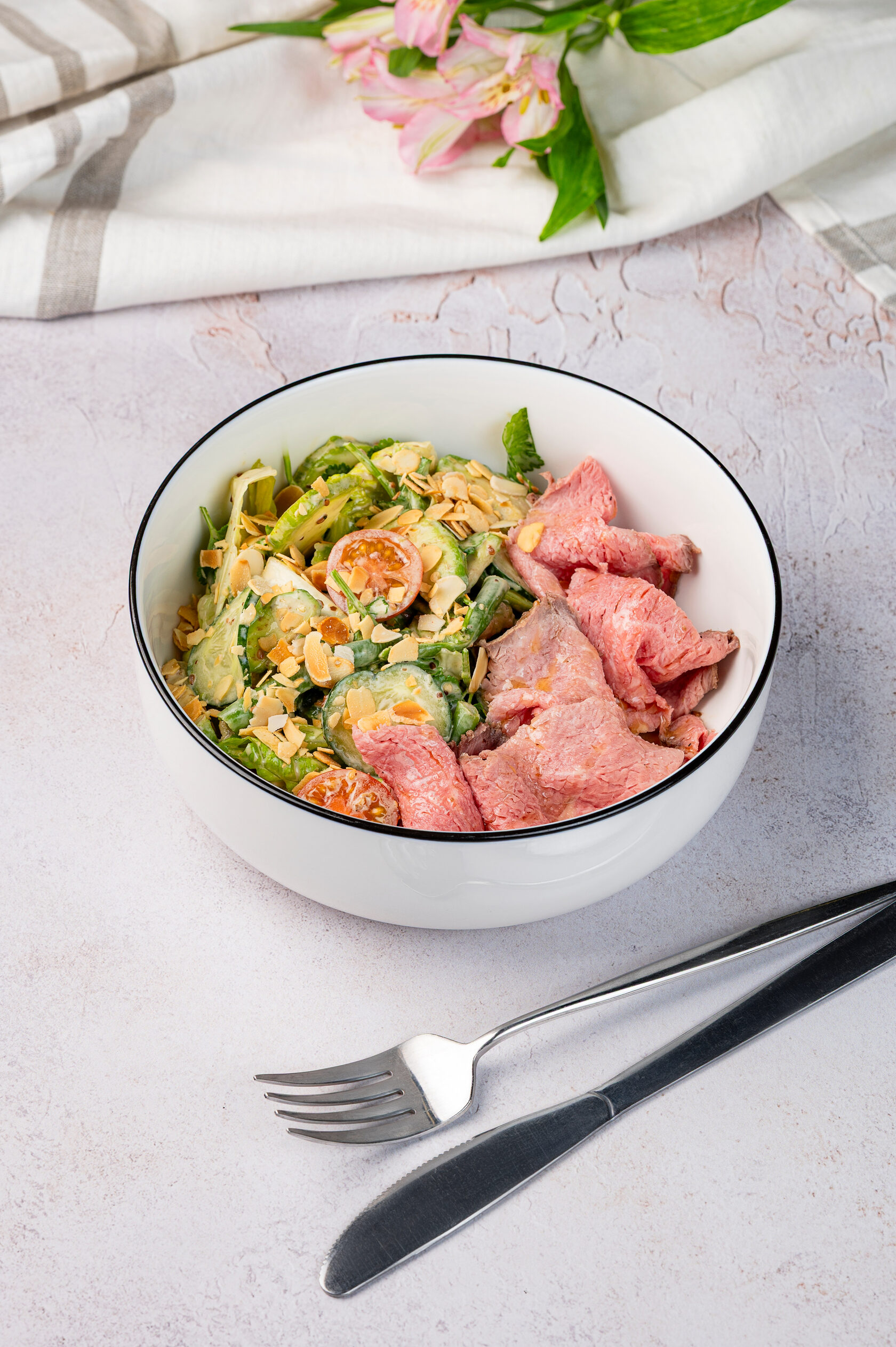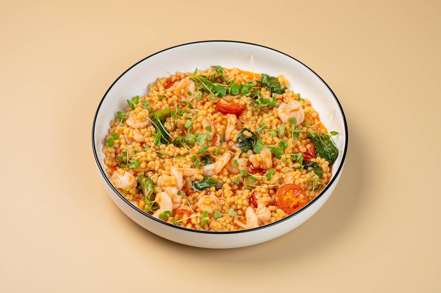 Состав: Масло растительное, Филе куриное со специями, Кускус, Огурец свежий, Салат свежий, Соль экстра, Перец черный горошком, Мусс из пармезана (Сливки 35%, Сыр творожный Креметта Хохланд, Сыр пармезан литовский, Крахмал картофельный), Масло томатное (Масло растительное, Паста томатная, Паприка красная сладкая)