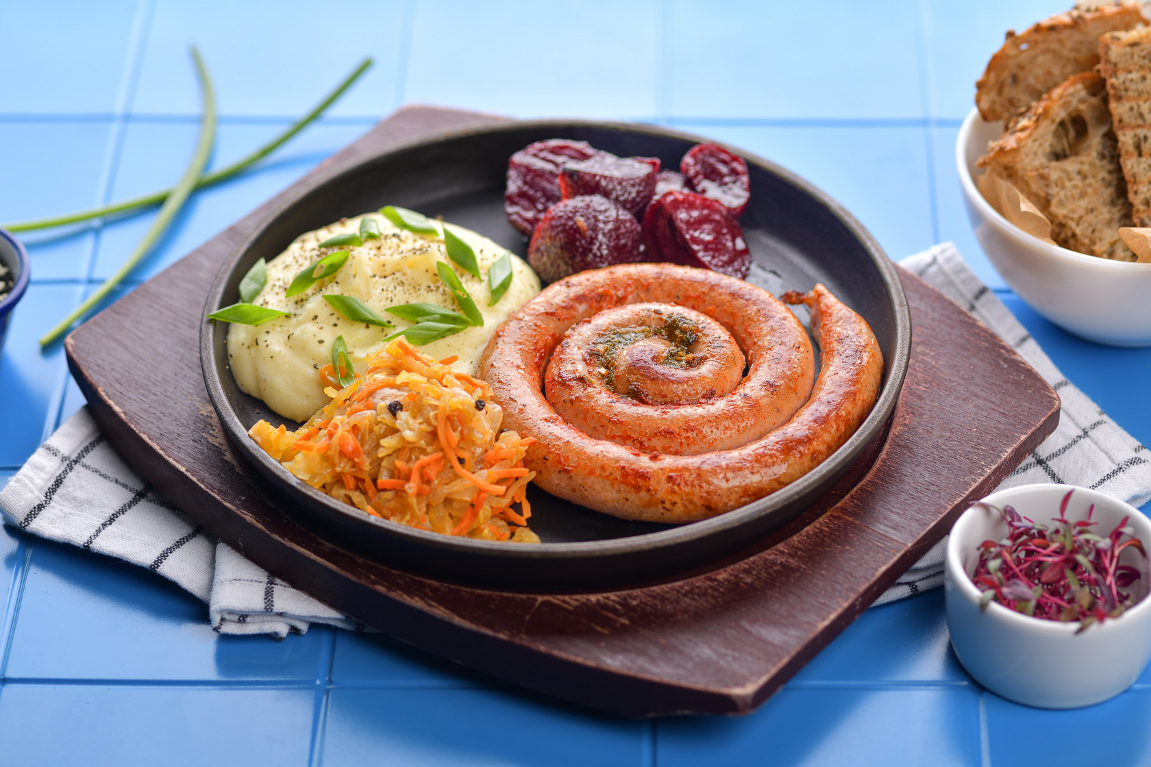 Сочная кёнигсбергская колбаска из свиного мяса, закрученного в рулет, подается вместе с воздушным картофельным пюре, вместе с тушёной капустой, рубиново-красной маринованной свёклой и свежего зелёного лука