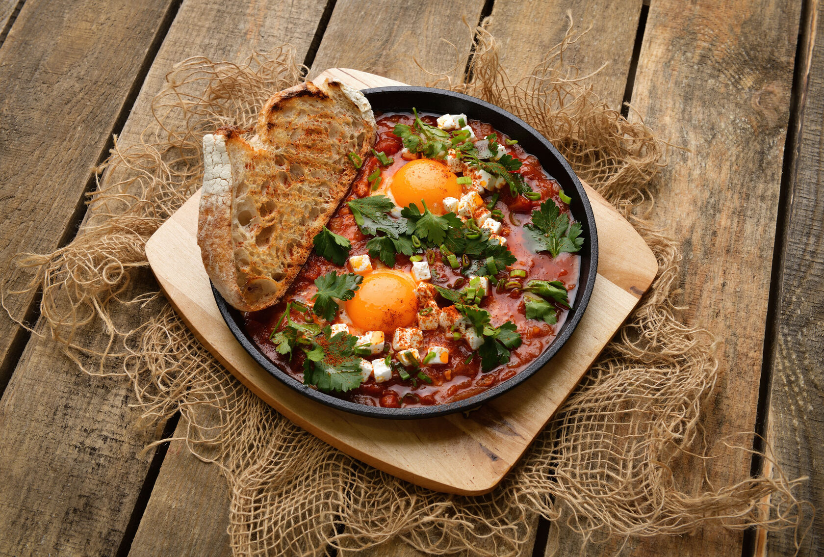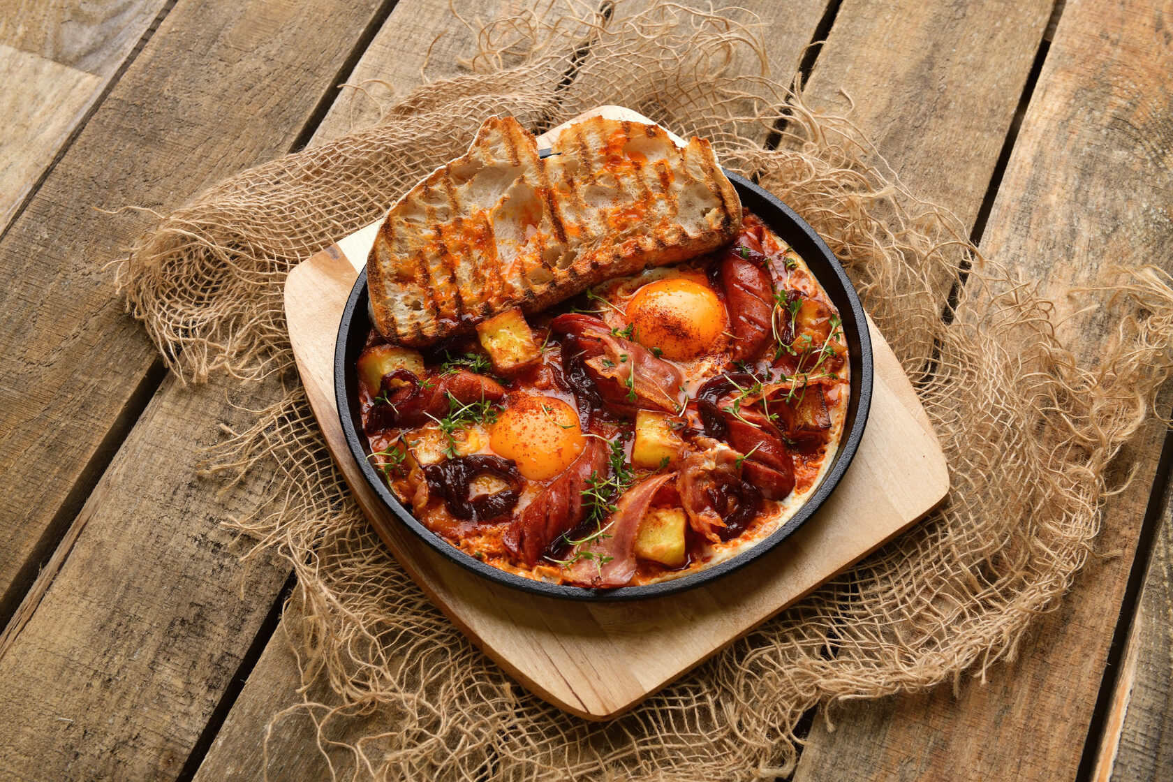 Сытный завтрак, для тех, кому необходимо восстановить силы или зарядиться энергией на весь день. На сковороде запекаем печеный картофель с 2мя куриными яйцами, в нашем фирменном соусе из помидор, пикантными охотничьими колбасками, беконом и карамелизированным луком. Подаем со свежеобжаренным тостом из хлеба тартин.