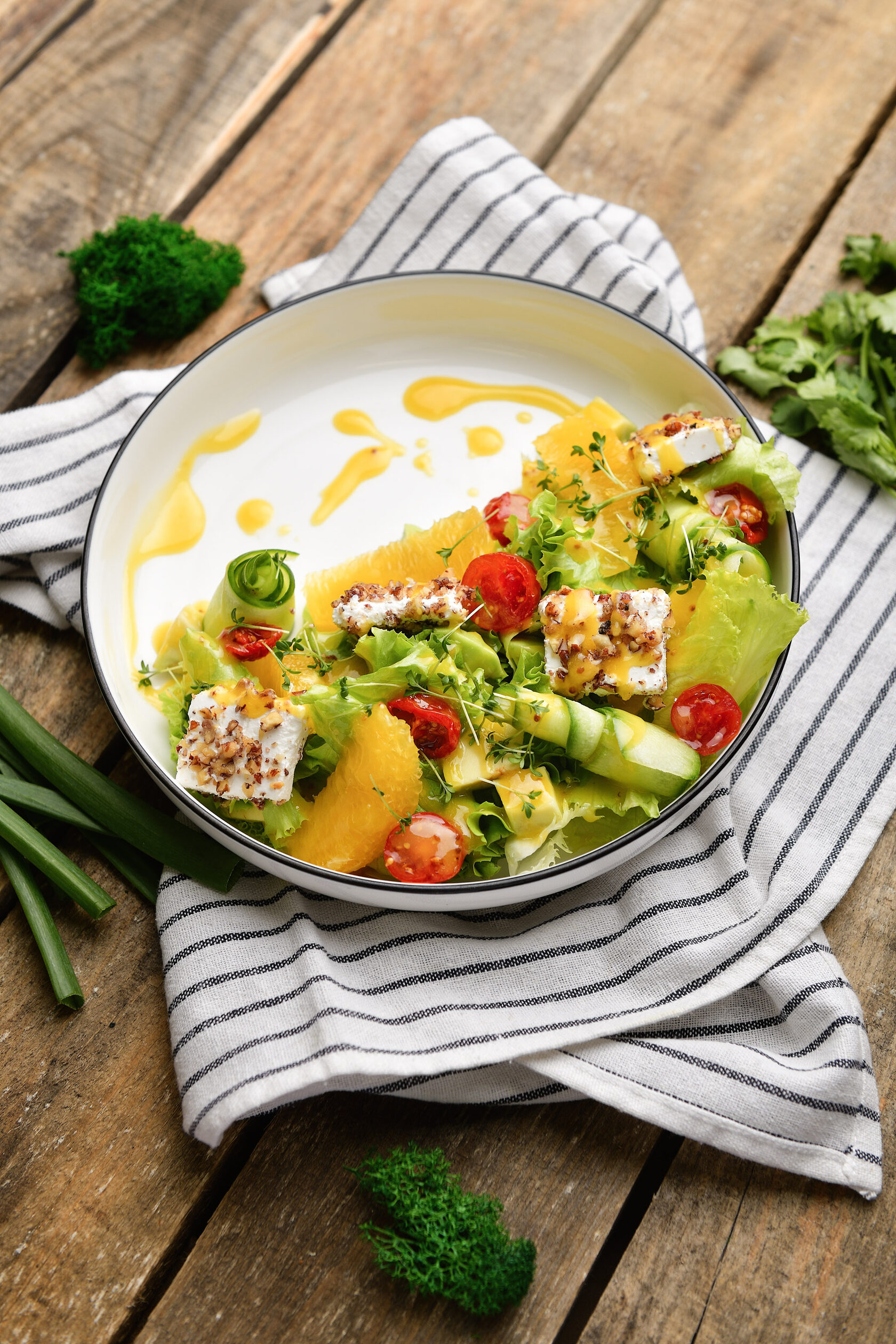 Яркий летний салат со свежим салатом, апельсинами, томатами, огурцами и сыром Фета в ореховой панировке из пекана. Заправляем соусом на основе растительных масел и горчицы с добавлением пюре манго и маракуйи, яблочного уксуса и меда.