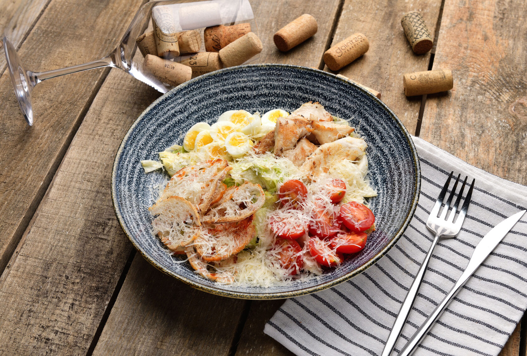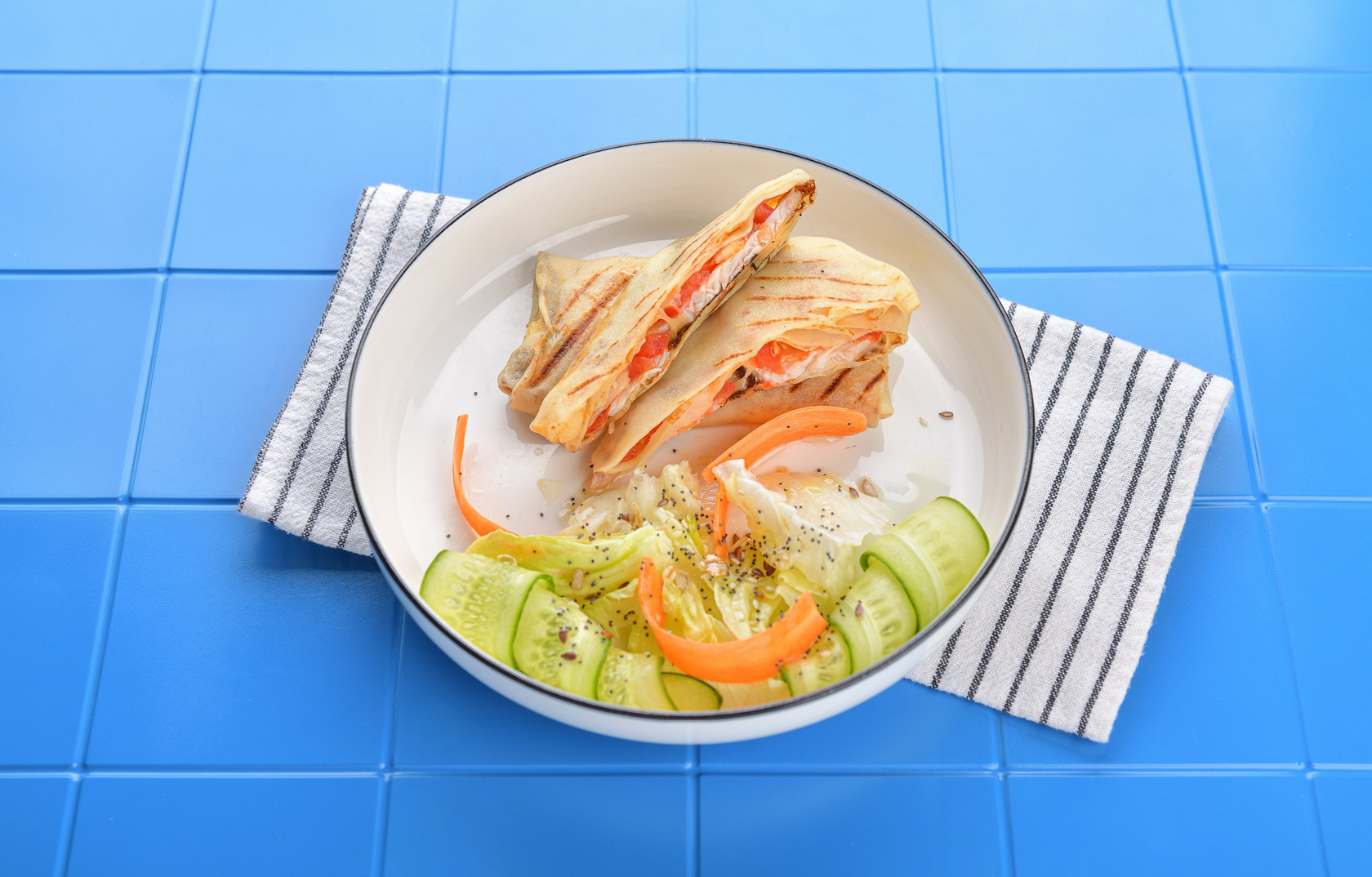 Ароматные блины, обжаренные до золотистой корочки, идеально сочетаются с нежными ломтиками ароматного сыра, аппетитной индейкой, сочными свежими помидорами. Подается блюдо с овощным салатиком из огурцов и морковки, вместе с соусом нисуаз и зерновой посыпкой.