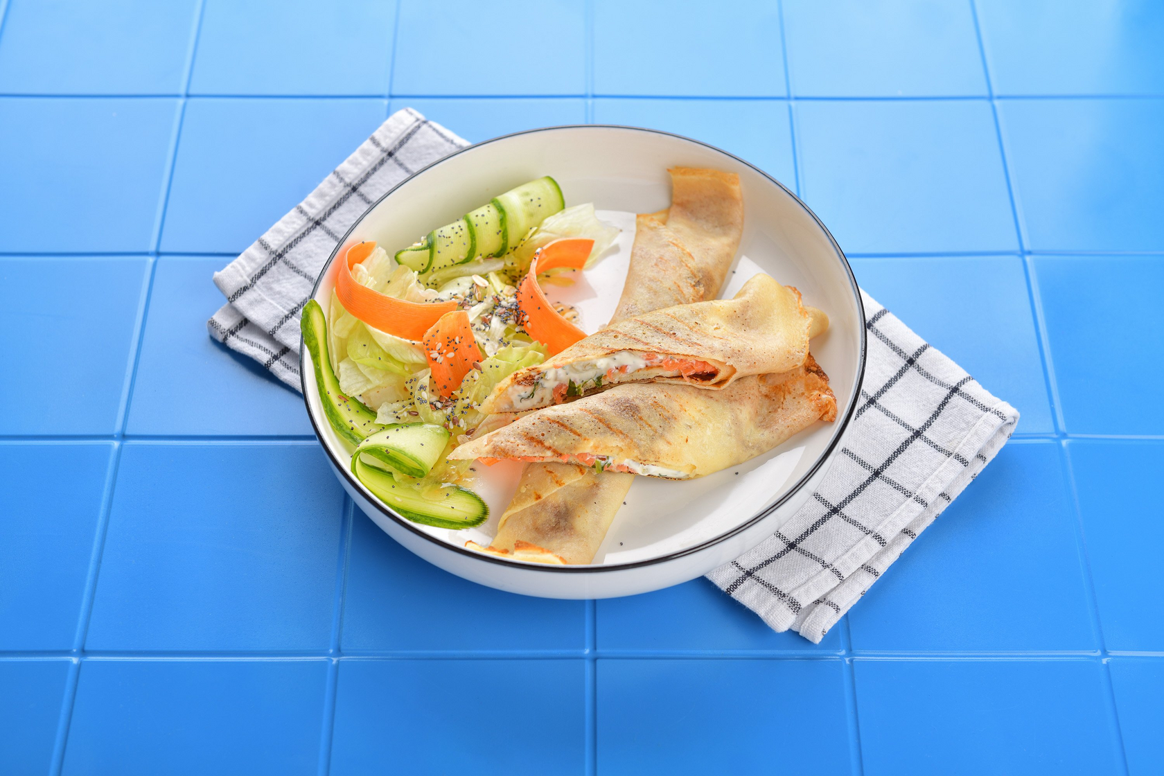 Ароматные блины, обжаренные до золотистой корочки, идеально сочетаются с нежным сливочным сыром, дополненным свежей зеленью. Семга, аккуратно нарезанная ломтиками, добавляет изысканности вкуса. Подается с овощным салатиком из огурцов и морковки, вместе с соусом нисуаз и зерновой посыпкой
