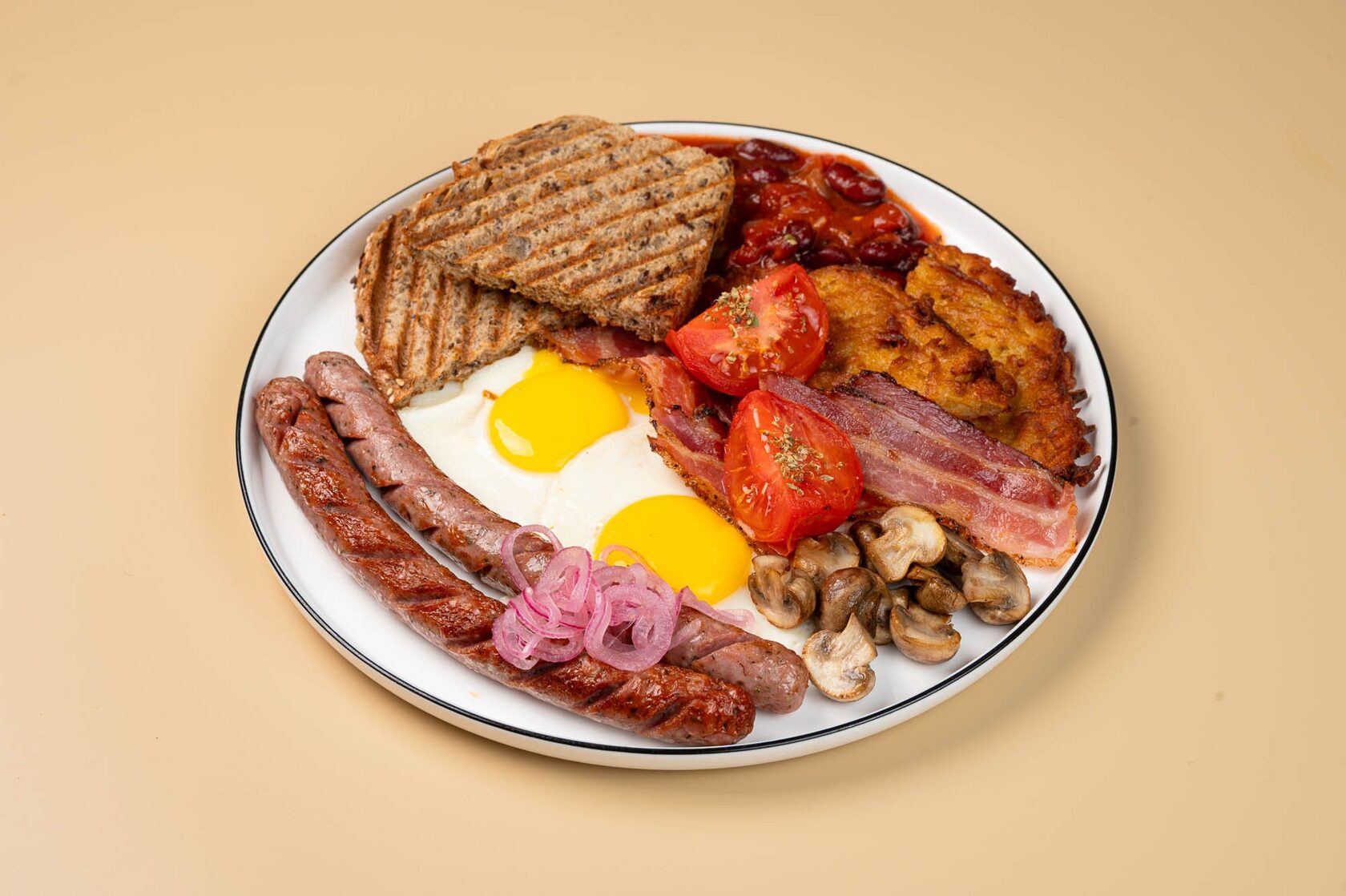 Сытный завтрак с яичницей-глазуньей, колбасками гриль, беконом, драником. печеной фасолью, шампиньонами и томатами. Подается с тостами из баварского хлеба.