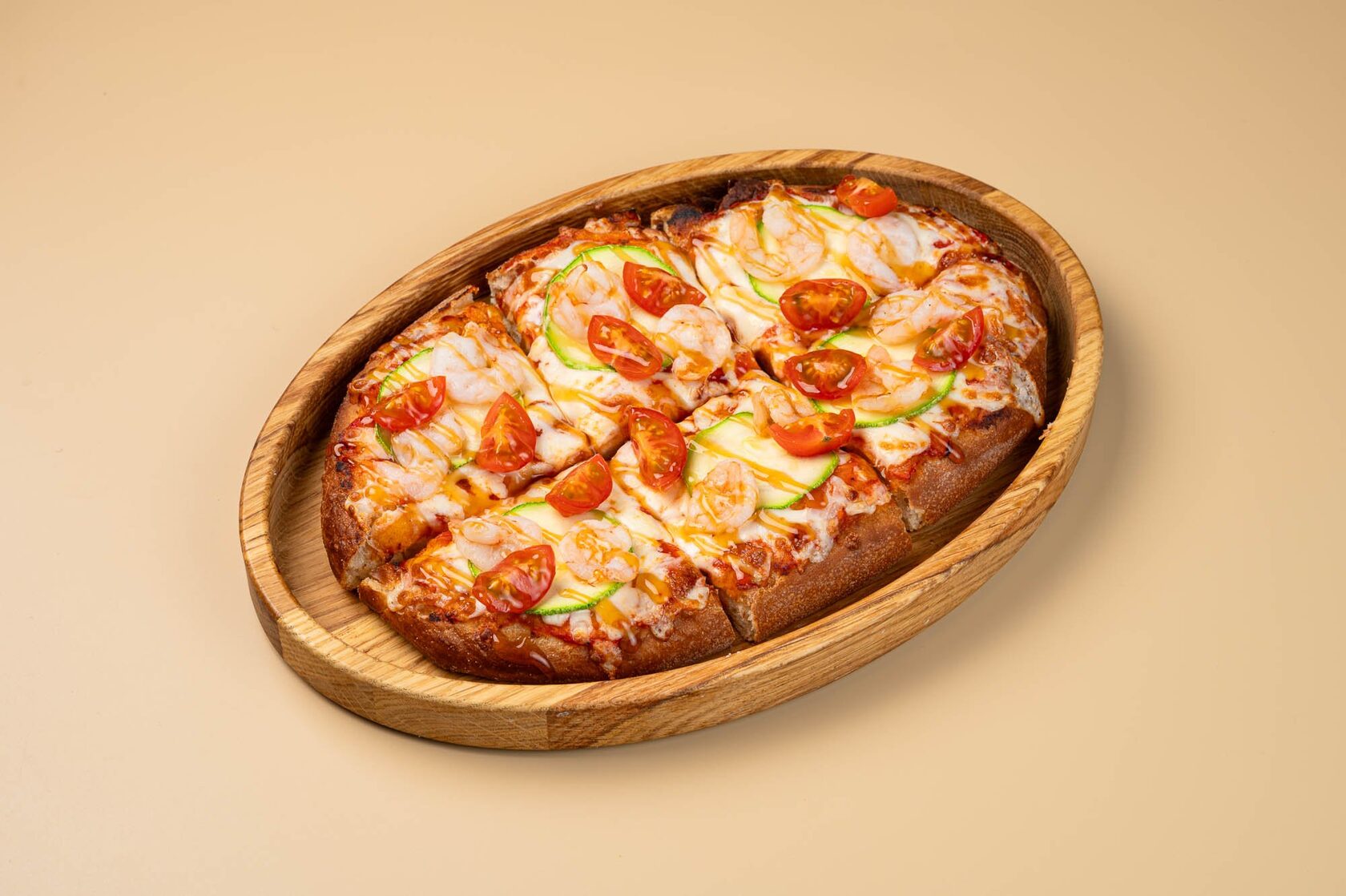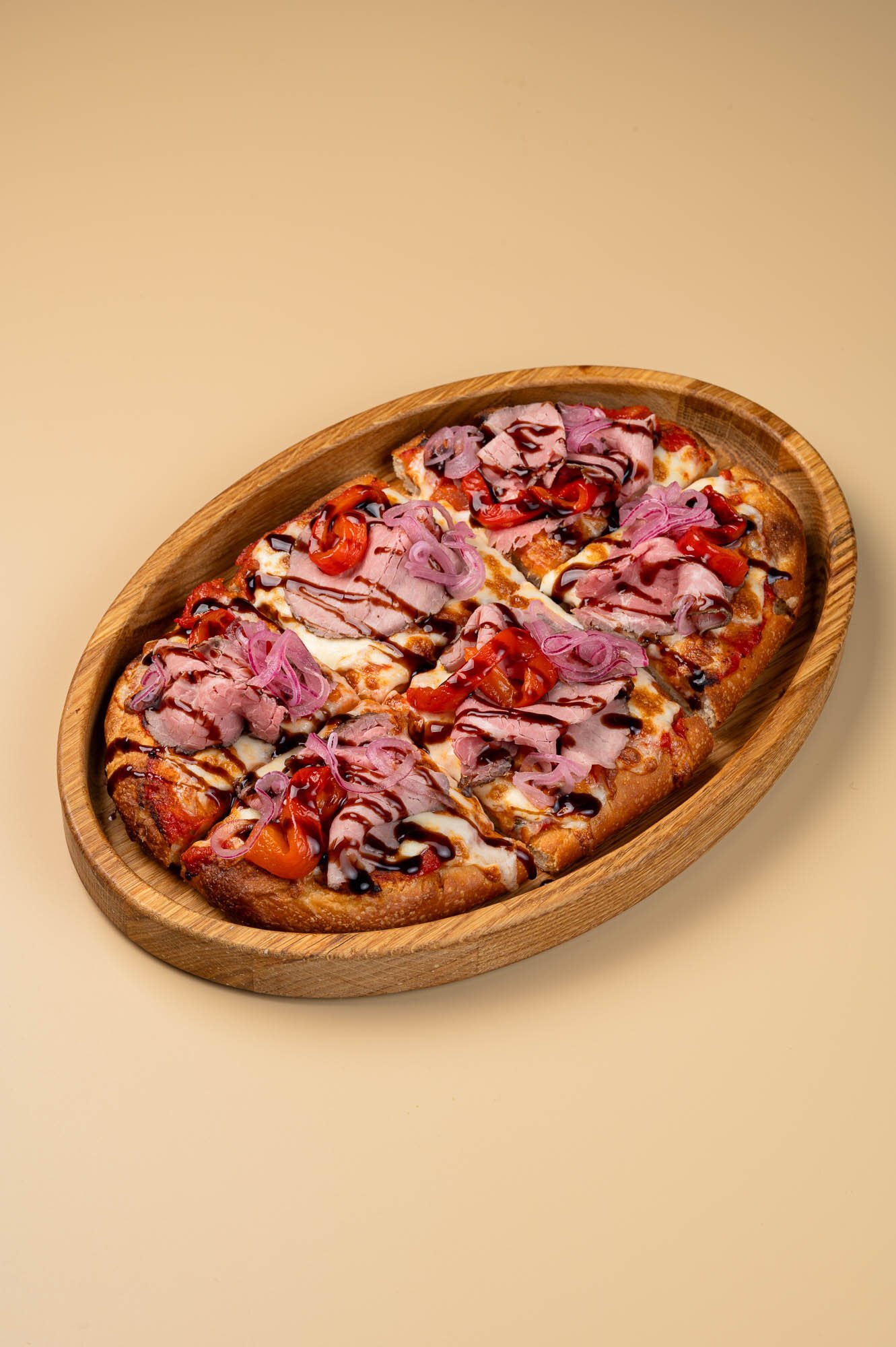 Римское пицца с хрустящей корочкой, сочный томатный соус, нежная моцарелла и щепотка сушёного орегано. Яркий акцент создаёт соус песто на основе свежего базилика, грецкого ореха и оливкового масла.