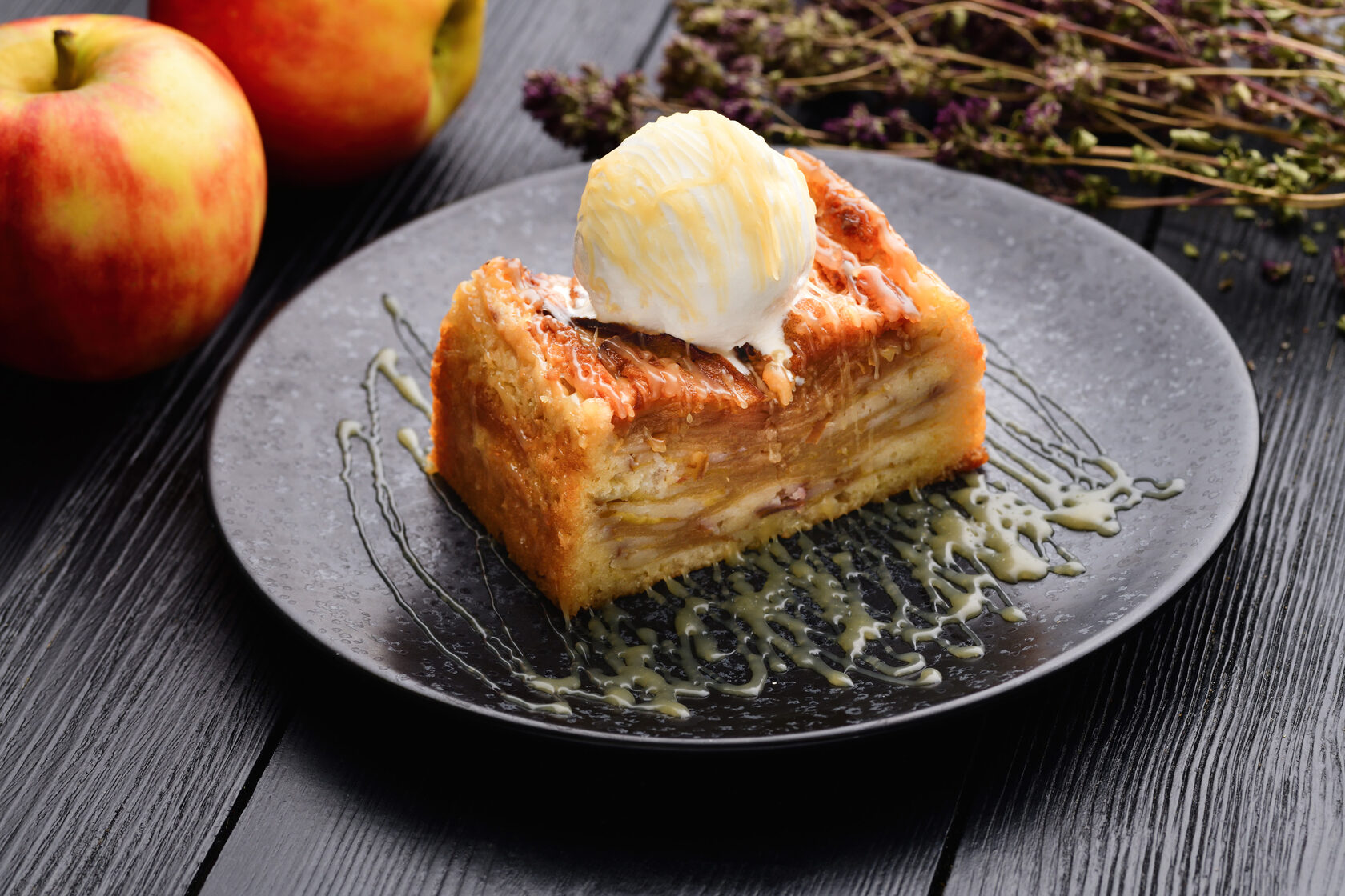 Домашний пирог из песочного теста с большим количеством красных сочных яблок подается с шариком ванильного мороженного с мисо (бобовая паста) с карамелью.