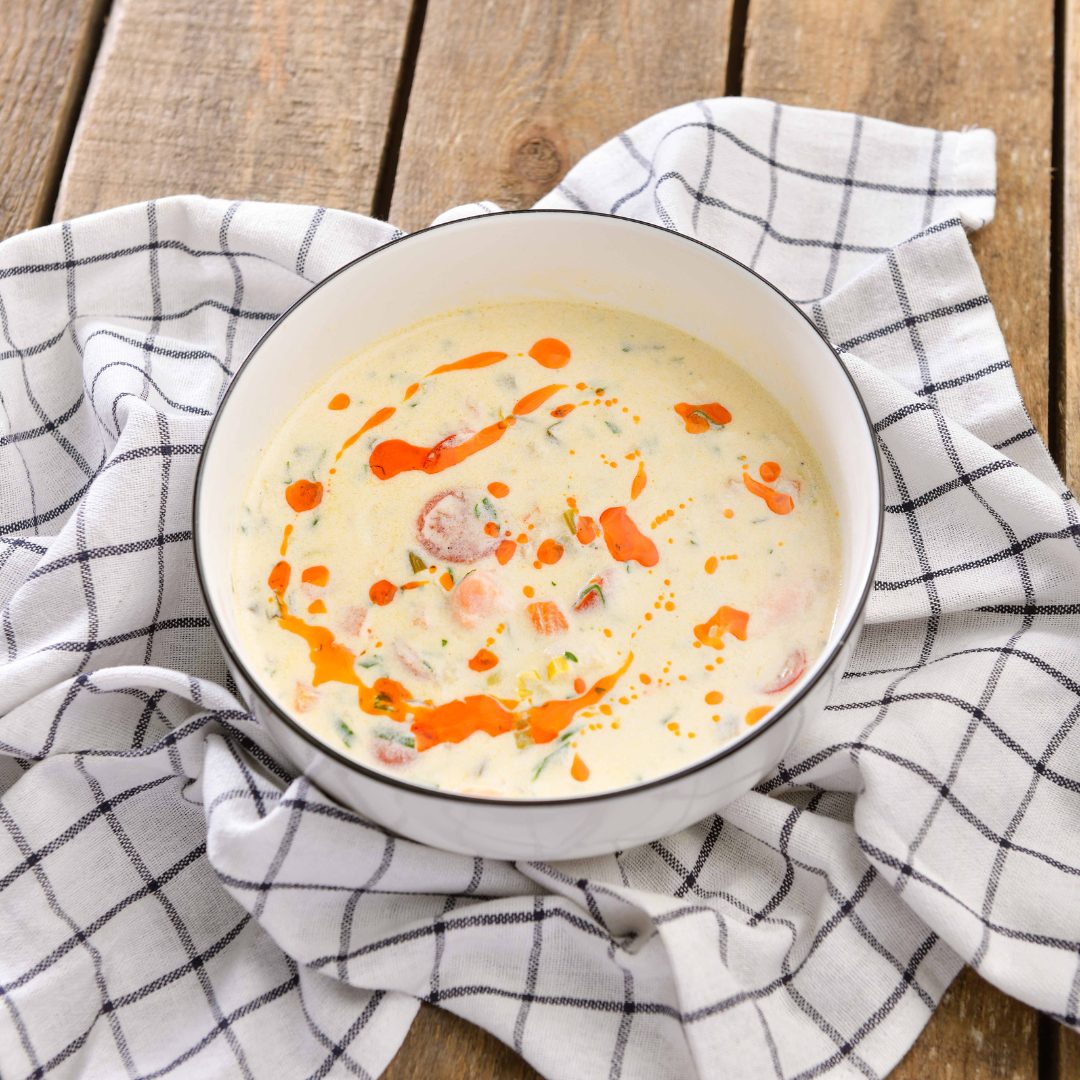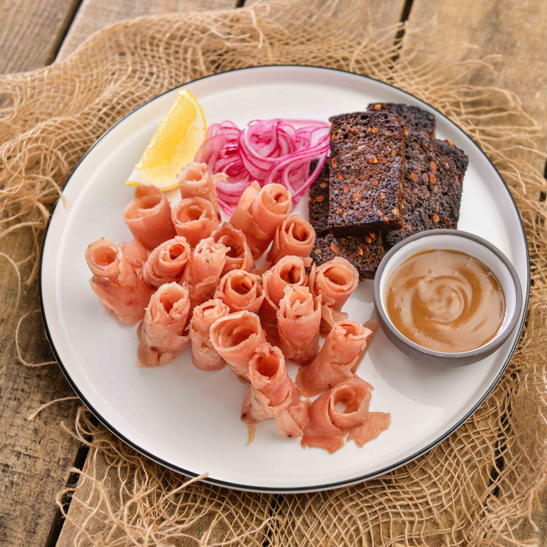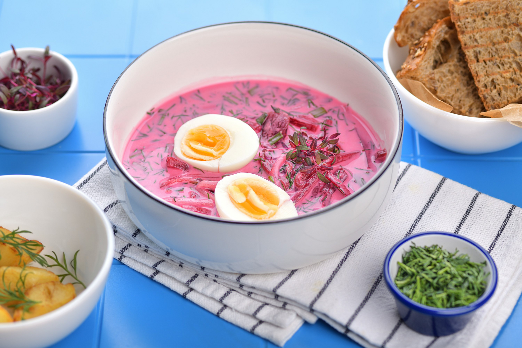 Холодный литовский борщ из нежной отварной свёклы, огурчиков, нарезанных соломкой, варёных яиц, редьки и зелени. Заправляется борщ кефиром, что придаёт ему пикантность благодаря хрену, горчице и чесночному аромату. Блюдо подаётся с обжаренными до золотистой корочки маленькими картофелинами черри, которые прекрасно дополняют его вкус.