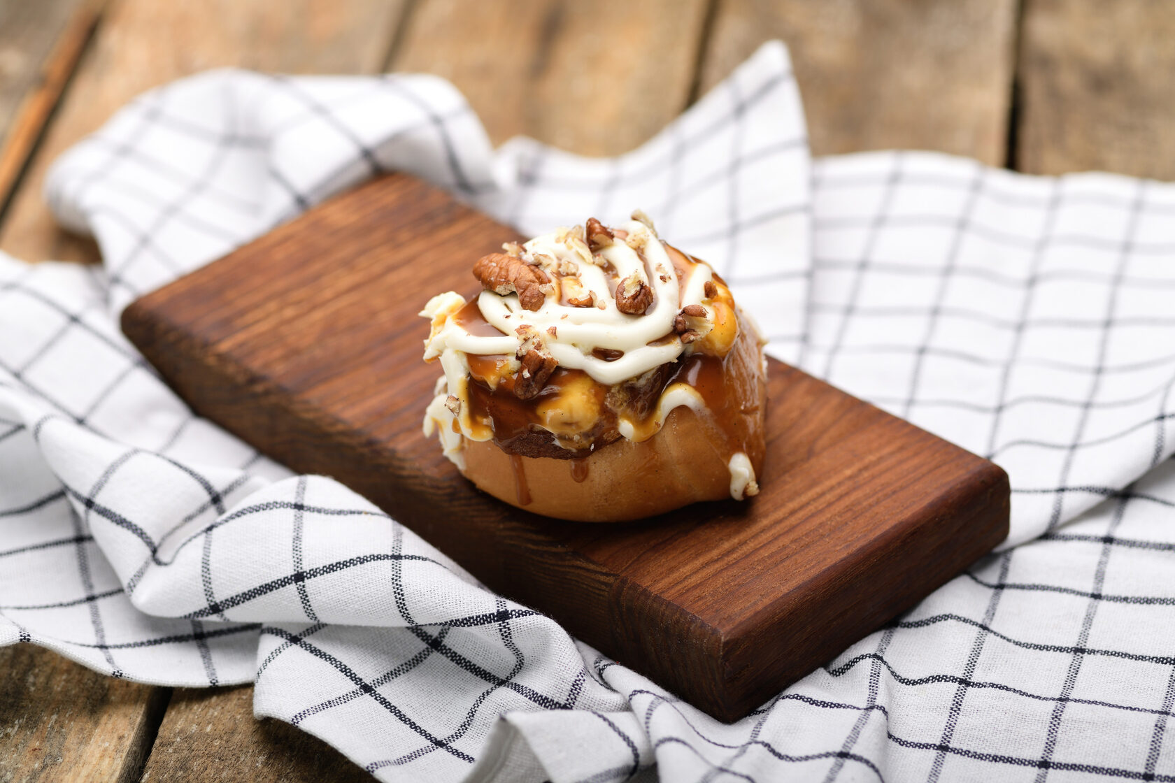 Вес: 120 г Описание: Нежное тесто с начинкой из корицы, украшенное сырной помадкой и соленой карамелью. Состав: Корица молотая, мука пшеничная, дрожжи, сахар, яйцо, сыворотка молочная, маргарин, яблочный мусс, спред сливочный, сыр сливочный, помадка сахарная, миндаль слоеный, соль Maldon, сироп глюкозный, сливки растительные, паста ванильная, молоко. Б/Ж/У/ккал/кДж: 4,09/17,17/43,11/343,28/1 436,3