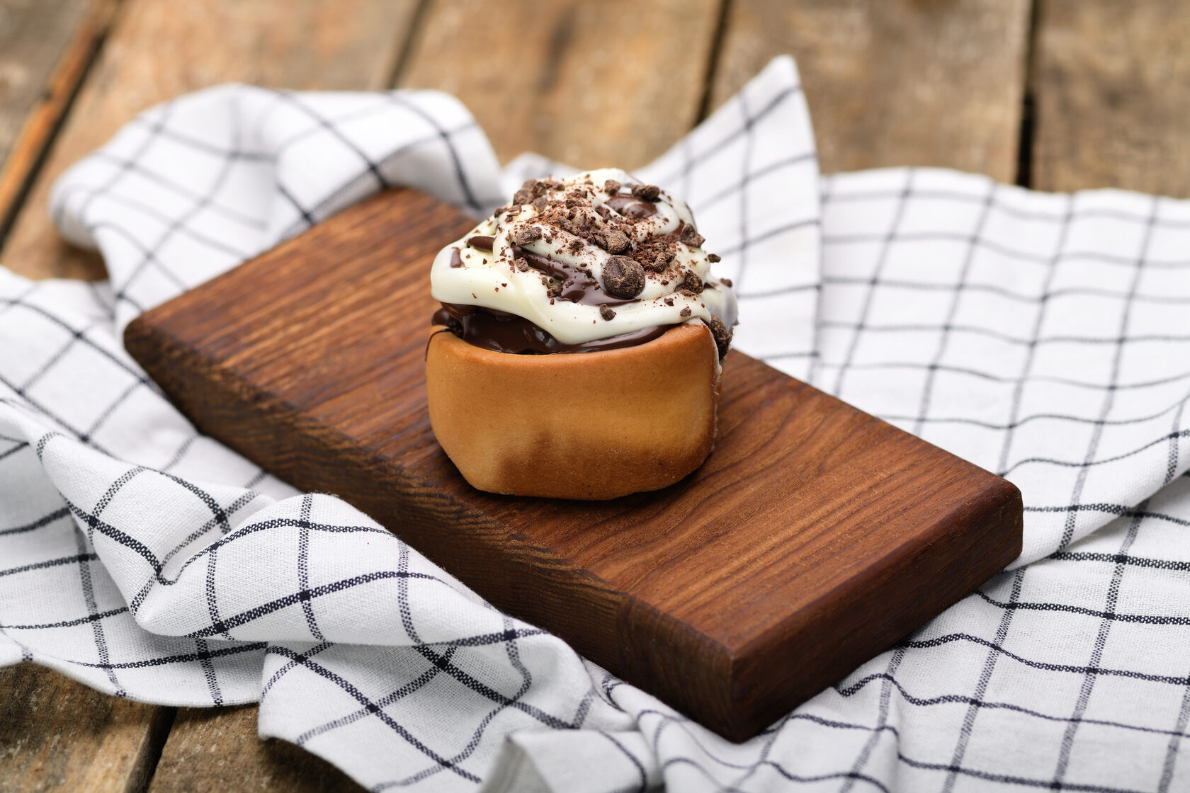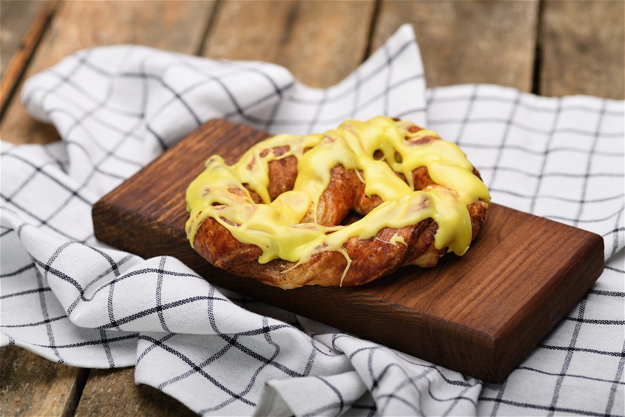 Вес: 95 г Описание: Нежное тесто с начинкой из корицы, украшенное сырной помадкой и бельгийским шоколадом. Состав: Корица молотая, мука пшеничная, дрожжи, сахар, яйцо, сыворотка молочная, маргарин, яблочный мусс, спред сливочный, сыр сливочный, помадка сахарная, крем ореховый. Б/Ж/У/ккал/кДж: 17,23/49,39/152,83/1 127,79/4 706,13