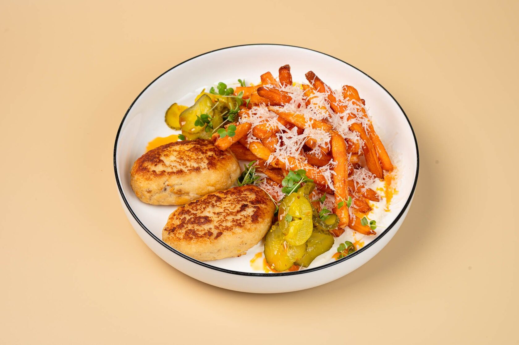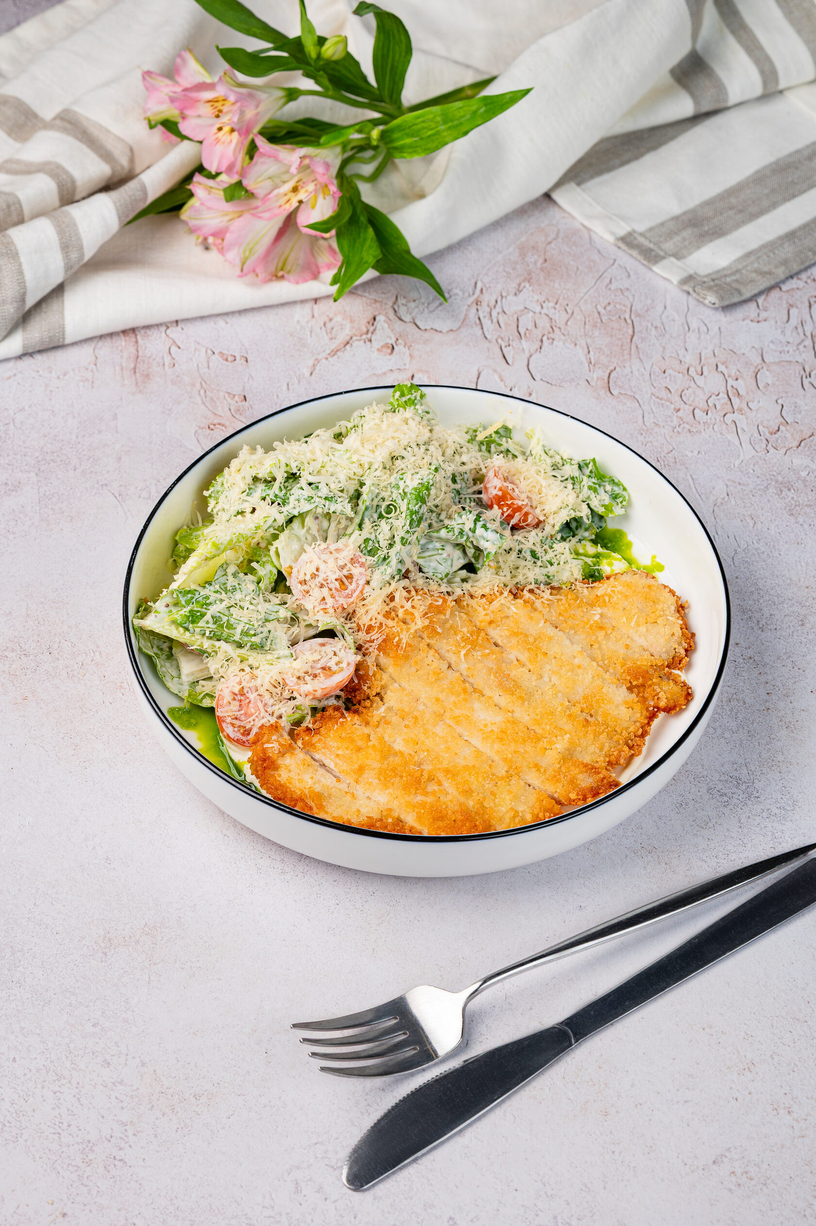 Нежное куриное филе со специями в сочетании с лёгким кускусом, свежими овощами и салатом, дополненное воздушным муссом из пармезана и ароматным томатным маслом.