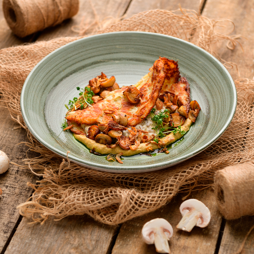 Ароматные блины, обжаренные до золотистой корочки, идеально сочетаются с нежными ломтиками ароматного сыра «Тильзитер», аппетитной ветчиной, сочными свежими помидорами. Подается блюдо с овощным салатиком из огурцов и морковки, вместе с соусом нисуаз и зерновой посыпкой.