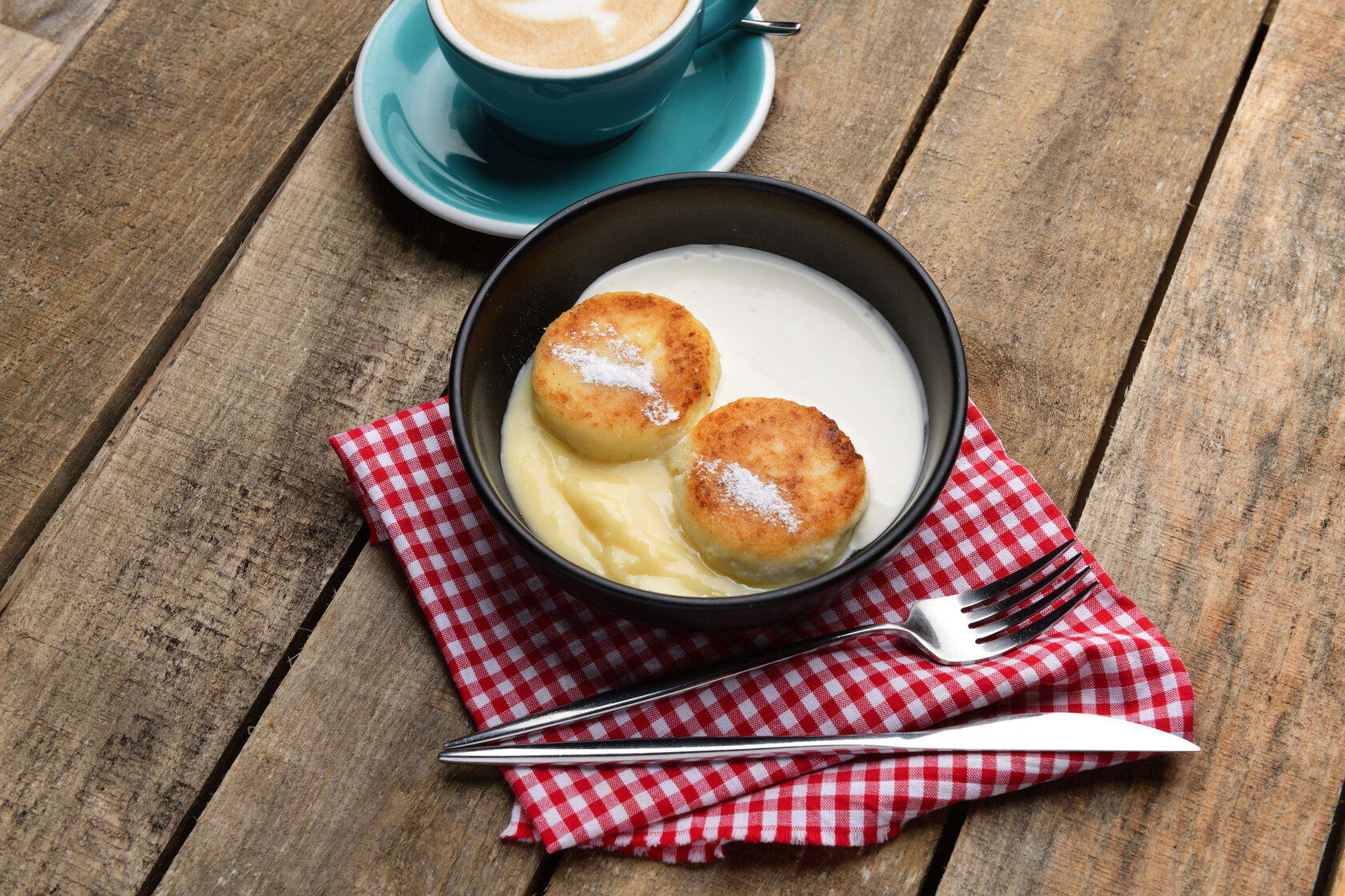 Наш фирменный топовый завтрак из нежного творога. Обжарены до золотистой корочки с взбитой лимонной сметены и соуса на Ваш выбор: пряный вешневый соус, кокосовая сгущенка, крем лайм-кокос