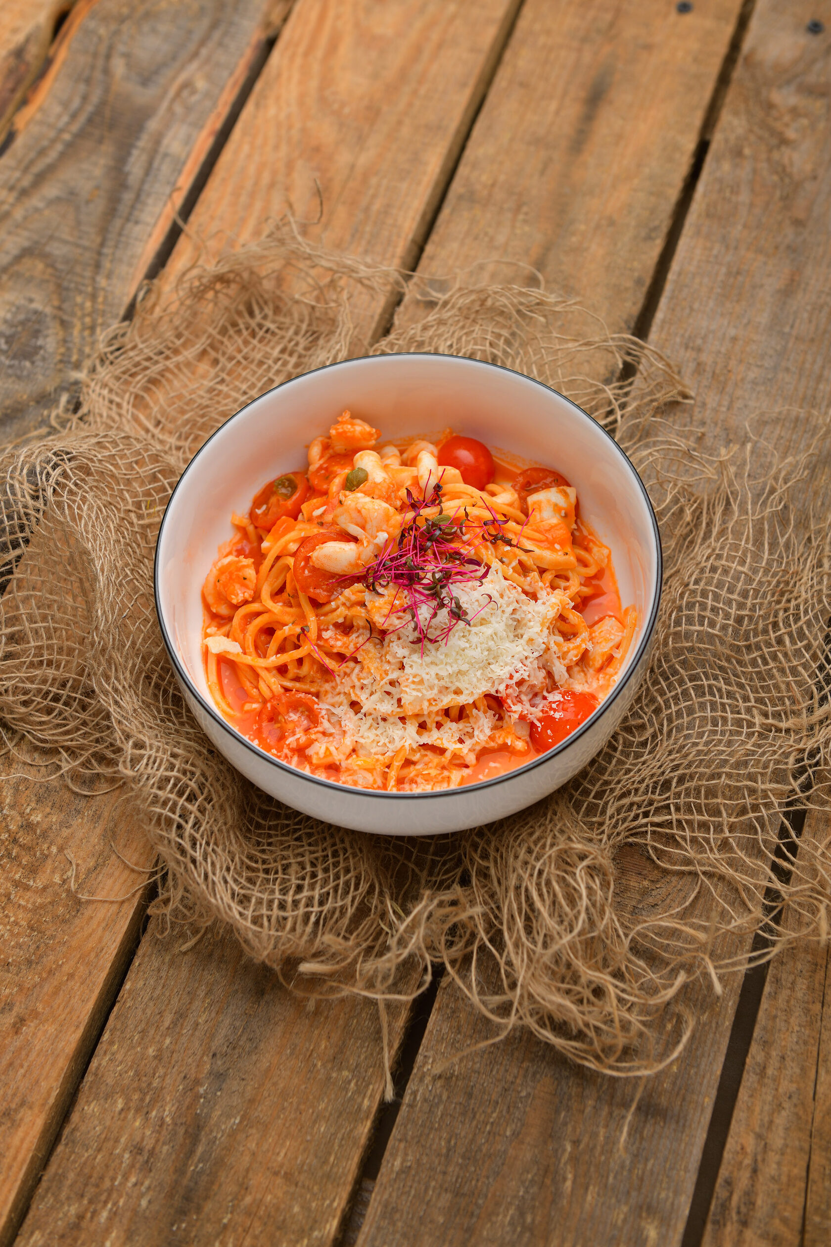 Яркая паста в традиционном итальянском соусе аррабиата (томатный соус с каперсами) с кальмарами, креветками и помидорами черри. Подаем с сыром Пармезан.