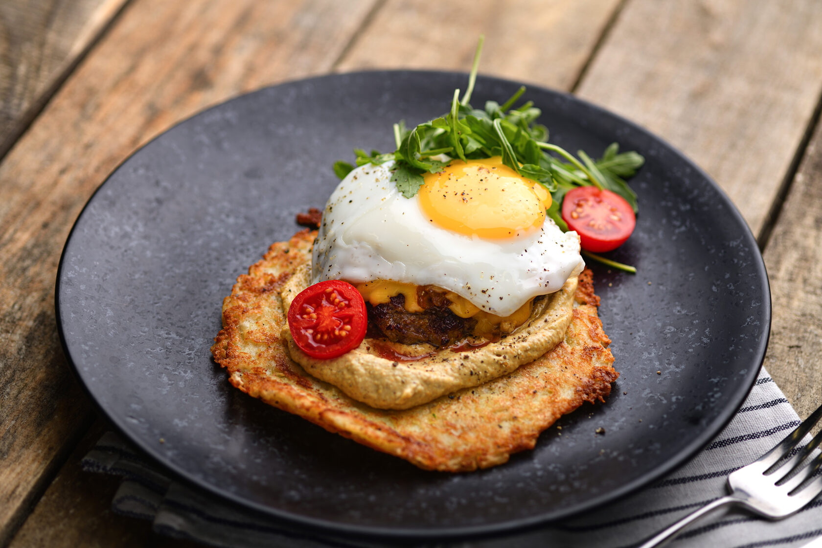 Сочный бифштекс на картофельном дранике, подается с карамелизированным луком, сыром Чеддер и глазуньей. Сытное блюдо, которое идеально подойдет для обеда или ужина.