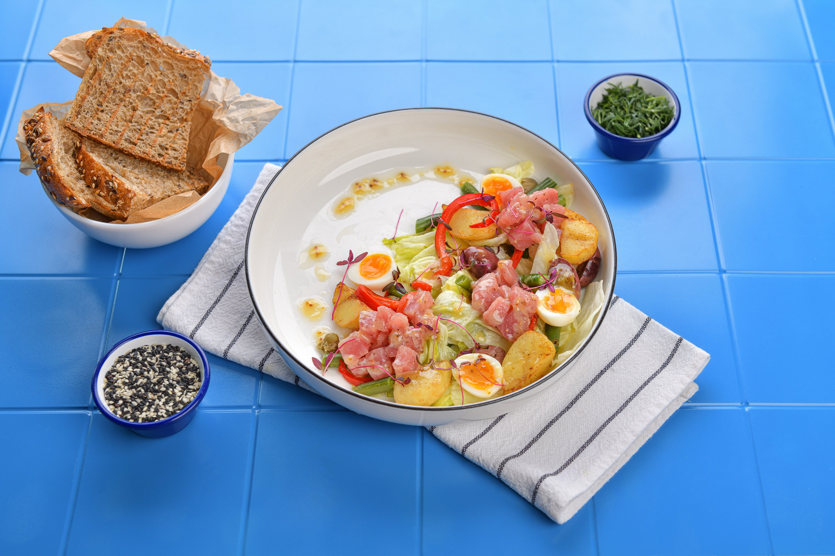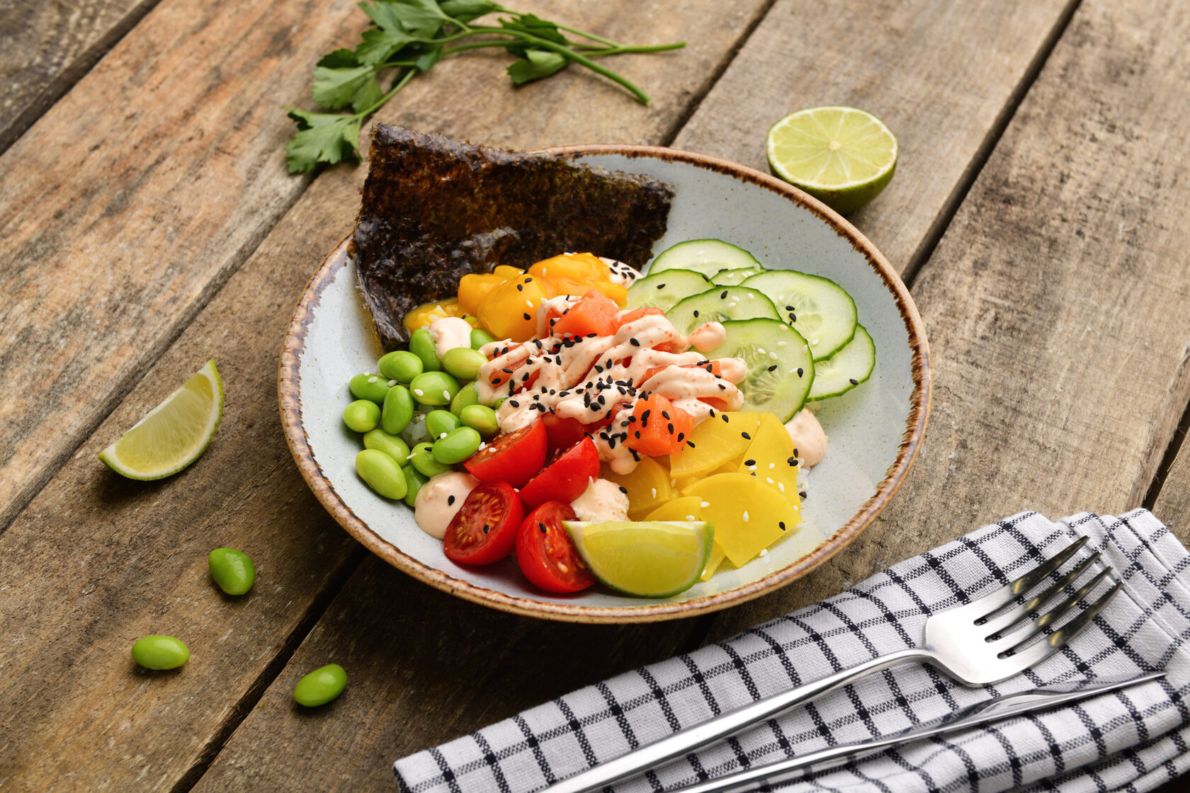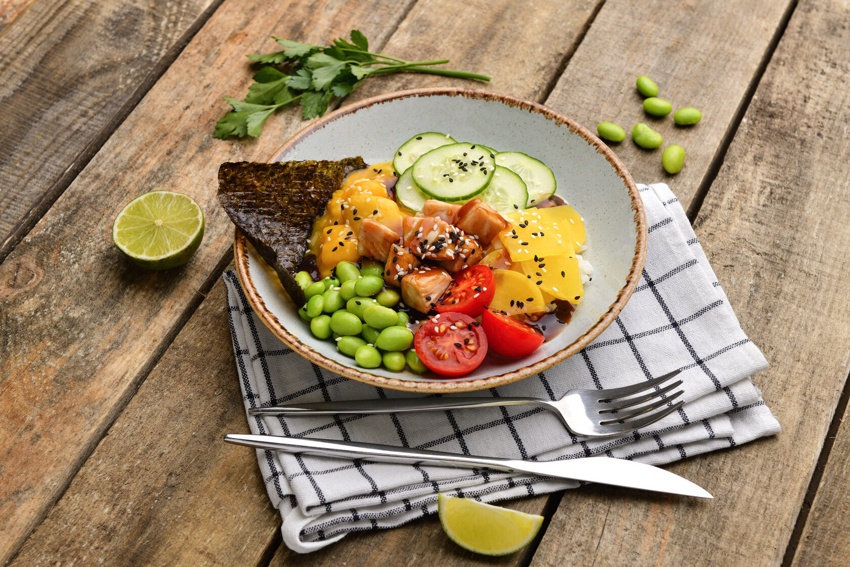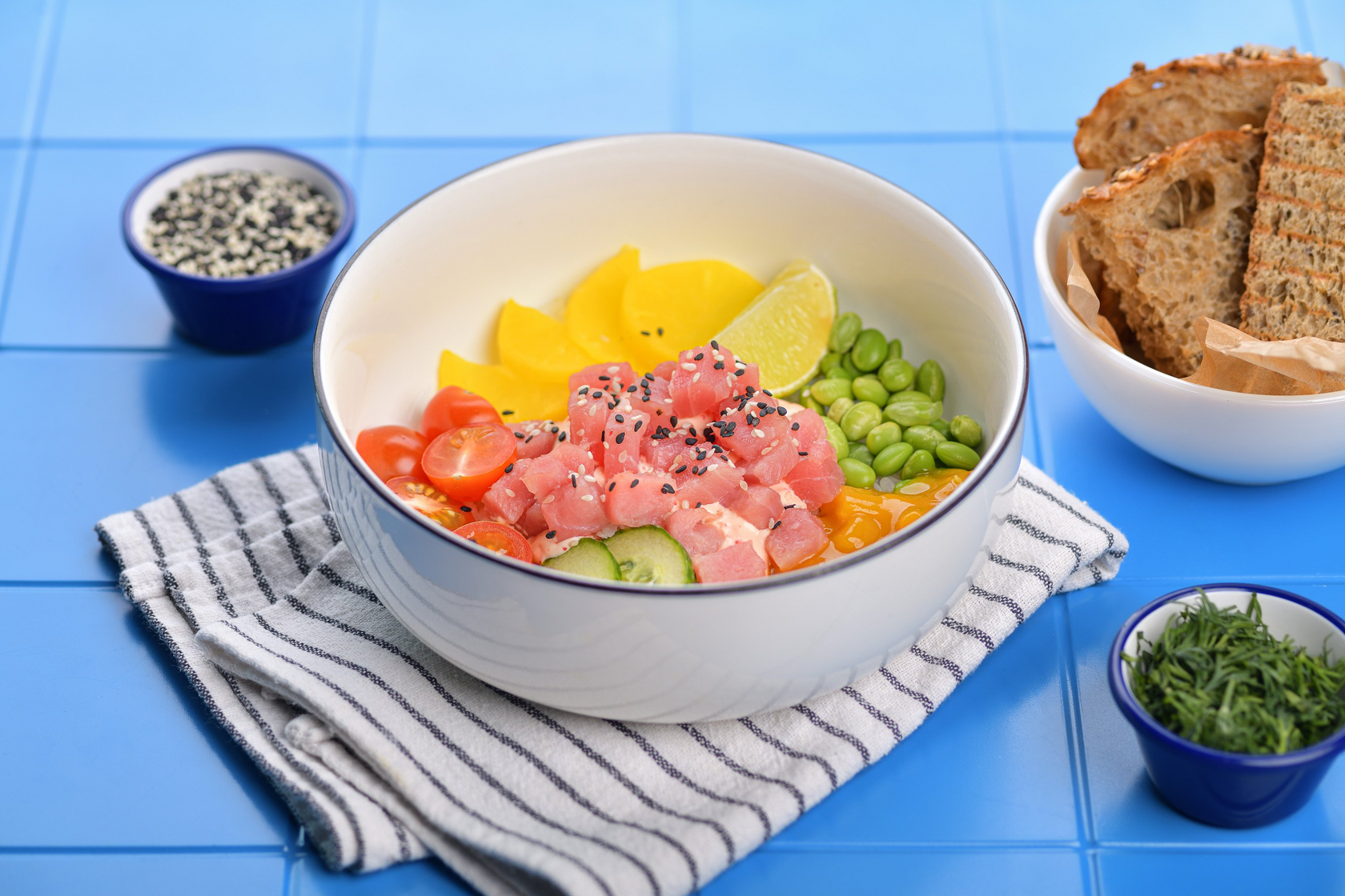 Поке с рисом и тунцом сочетает в себе свежесть помидоров черри, огурцов и редьки, сладость мангового конфитюра и кислость лайма. Подается с соусом спайси.