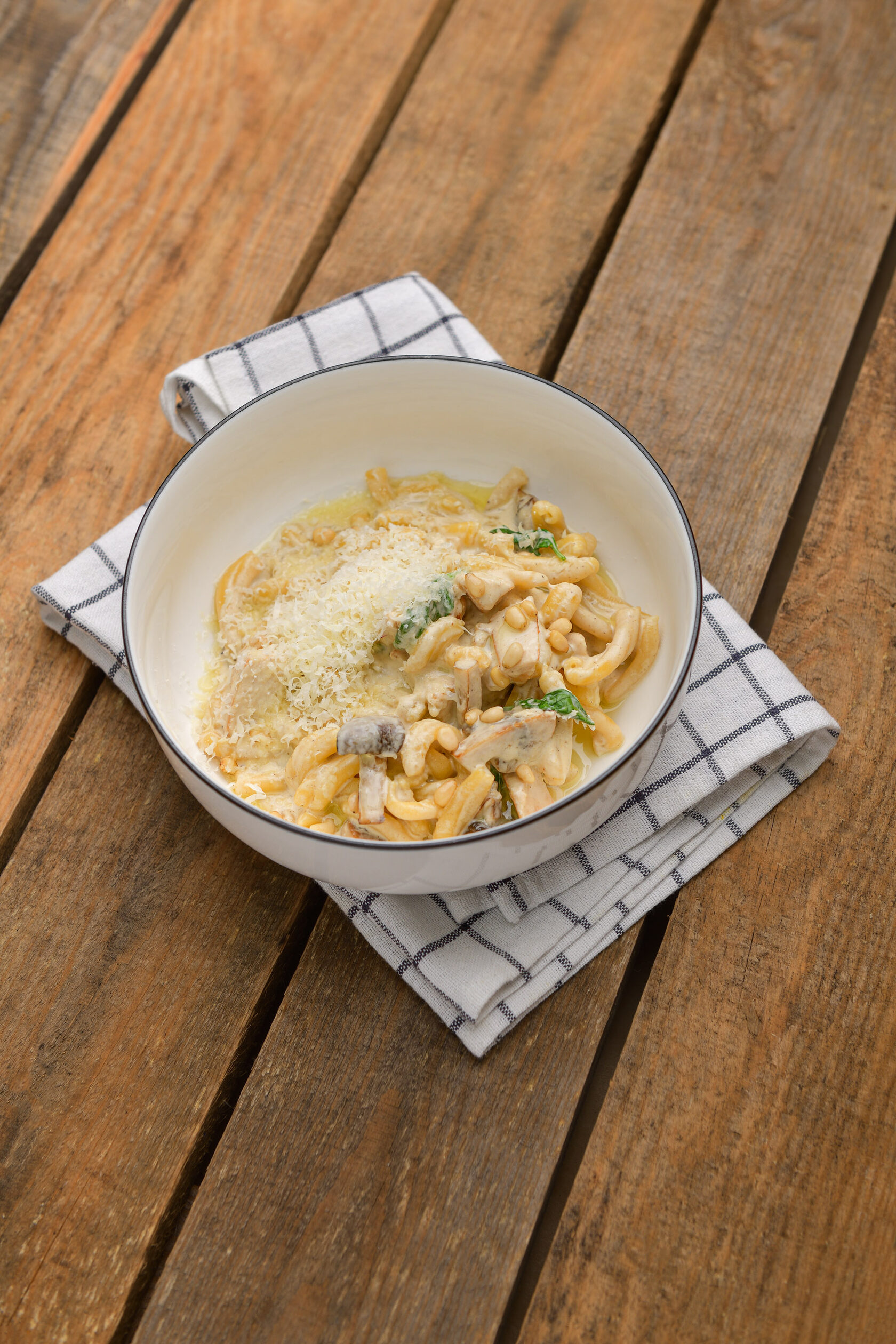 Нежную сливочную пасту с шампиньонами, куриной грудкой в соусе на основе крем-фреш с рикоттой, грибным майо с трюфелем и сыром пармезан подаем со свежим шпинатом.